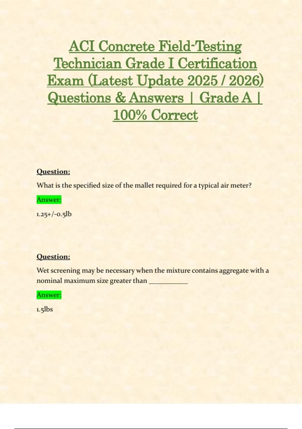 ACI Concrete Field-Testing Technician Grade I Certification Exam (Latest Update 2025 / 2026) Questions & Answers | Grade A | 100% Correct Question: What is the specified size of the mallet required for a typical air meter? Answer: 1.25+/-0.5lb Question: Wet screening may be necessary when the mixture contains aggregate with a nominal maximum size greater than ___________ Answer: 1.5lbs Question: If the concrete sample is to be consolidated by rodding, the measure is filled in ___________________layers. Answer: Three equal