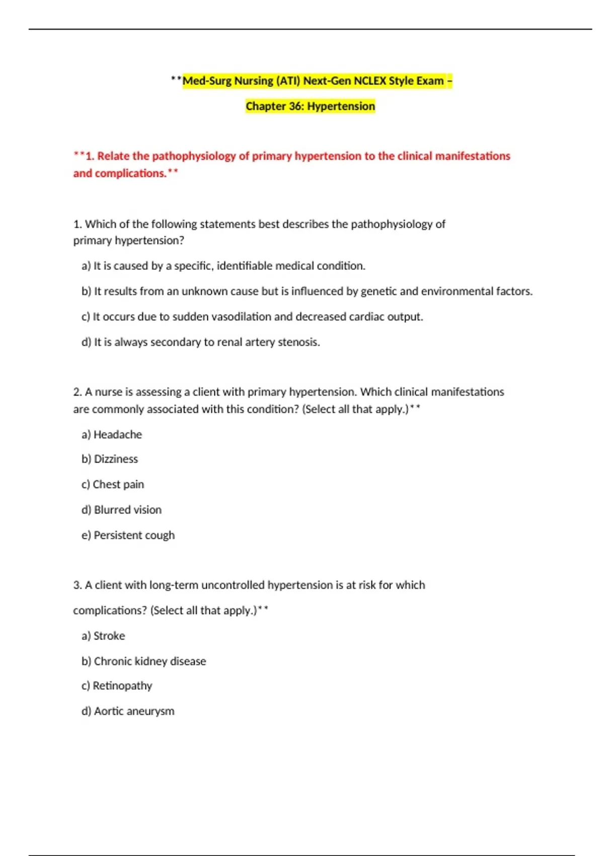 **1. Relate the pathophysiology of primary hypertension to the clinical manifestations