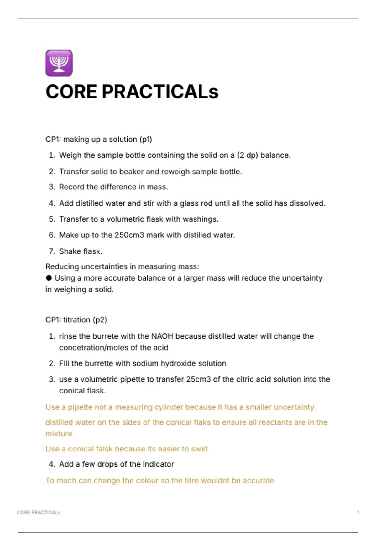 Summary A level AQA Chemistry core practicals