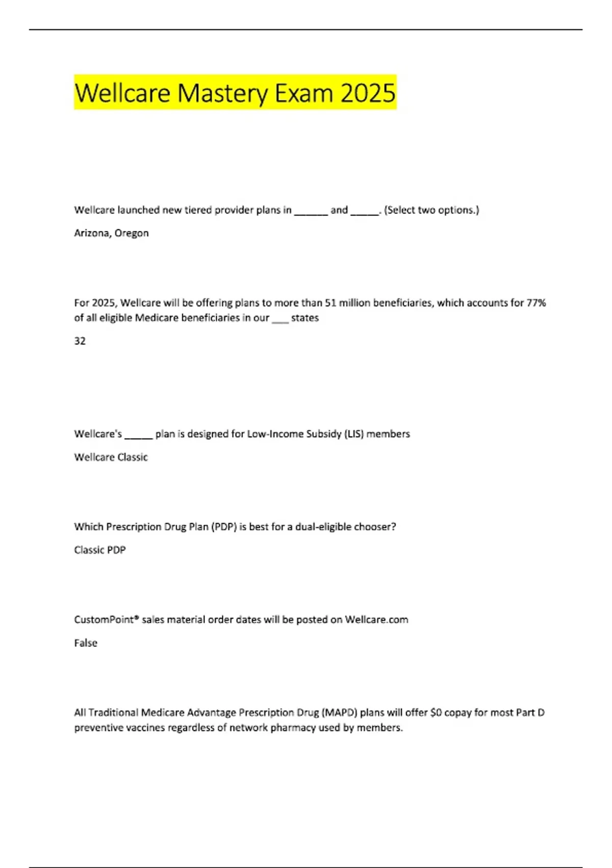 WellCare Mastery Exam 2025 Questions and Answers Study Guide 100% Distinctions Guaranteed Grade A+ Updated 2025/2026