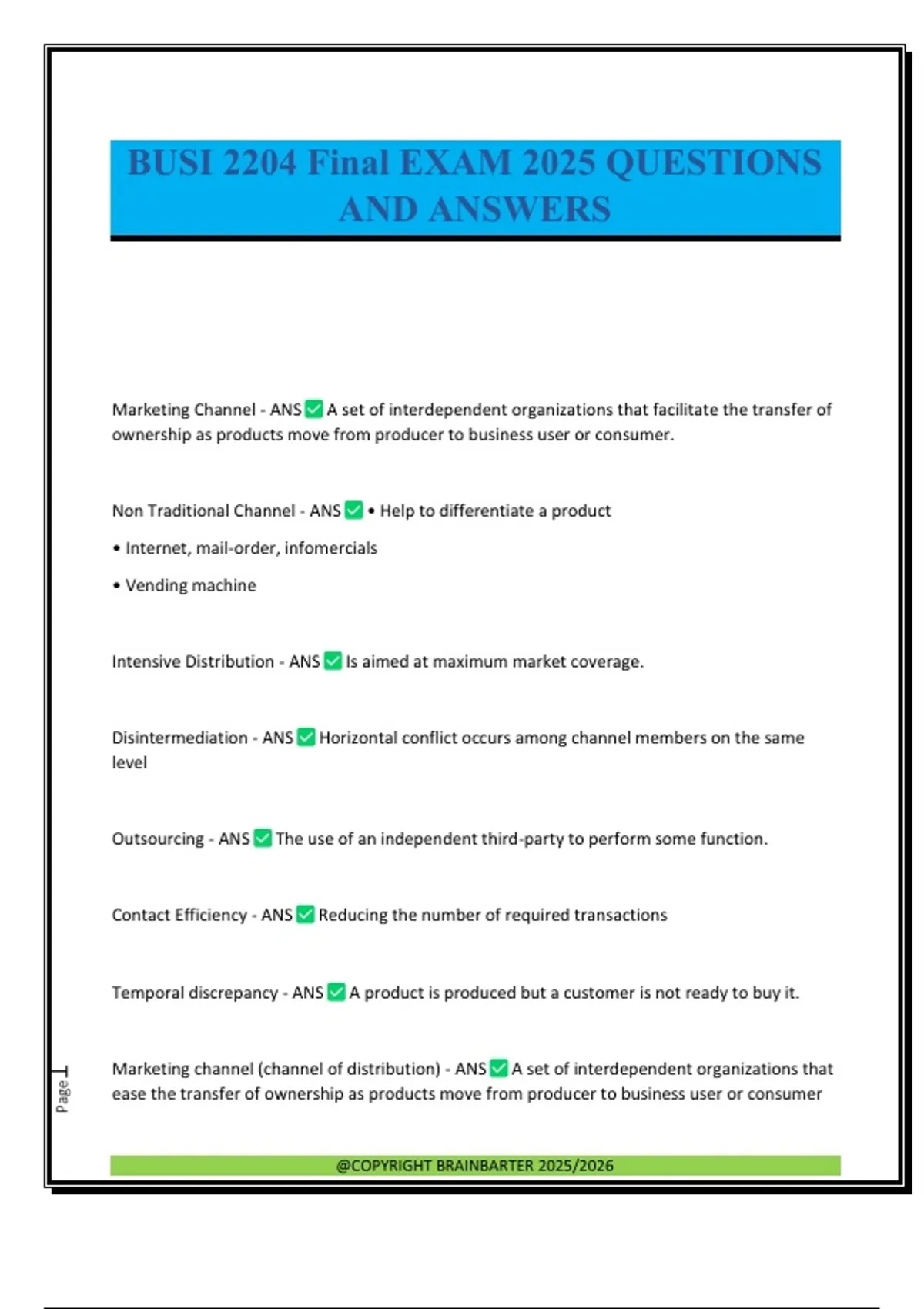 Marketing Channel - ANS A set of interdependent organizations that facilitate the transfer of ownership as products move from producer to business user or consumer. Non Traditional Channel - ANS • Help to differentiate a product • Internet, mail-order, infomercials • Vending machine Intensive Distribution - ANS Is aimed at maximum market coverage. Disintermediation - ANS Horizontal conflict occurs among channel members on the same level Outsourcing - ANS The use of an independent third-party to perform some function. Contact Efficiency - ANS Reducing the number of required transactions Temporal discrepancy - ANS A product is produced but a customer is not ready to buy it. Marketing channel (channel of distribution) - ANS A set of interdependent organizations that ease the transfer of ownership as products move from producer to business user or consumer @COPYRIGHT BRAINBARTER 2025/2026 Page2 Inventory Control System - ANS A method of developing and maintaining an adequate assortment of materials or products to meet a manufacturer's or a customer's demand. Channel Conflict - ANS A clash of goals and methods among distribution channel members Channel Control - ANS one marketing channel member intentionally affects another member's behavior Channel Leader (channel captain) - ANS a member of a marketing channel who exercises authority and power over the activities of other channel members Channel Members - ANS All parties in the marketing channel that negotiate with one another, buy and sell products, and facilitate the change of ownership between buyer and seller as they move the product from the manufacturer into the hands of the final consumer. Channel Partnering (Channel Cooperation) - ANS the joint effort of all channel members to create a supply chain that serves customers and creates a competitive advantage Channel Power - ANS a marketing channel member's capacity to control or influence the behavior of other channel members. Coverage - ANS Ensuring product availability in every outlet where potential customers might want to buy it. Direct Channel - ANS A distribution channel in which producers sell directly to customers. discrepancy of assortment - ANS the lack of all the items a customer needs to receive full satisfaction from a prod