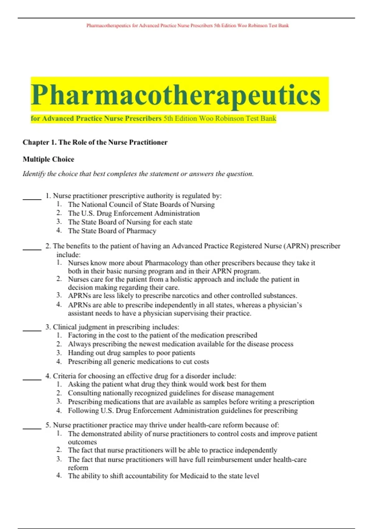 , Pharmacotherapeutics for Advanced Practice Nurse Prescribers 5th Edition Woo Robinson Test Bank