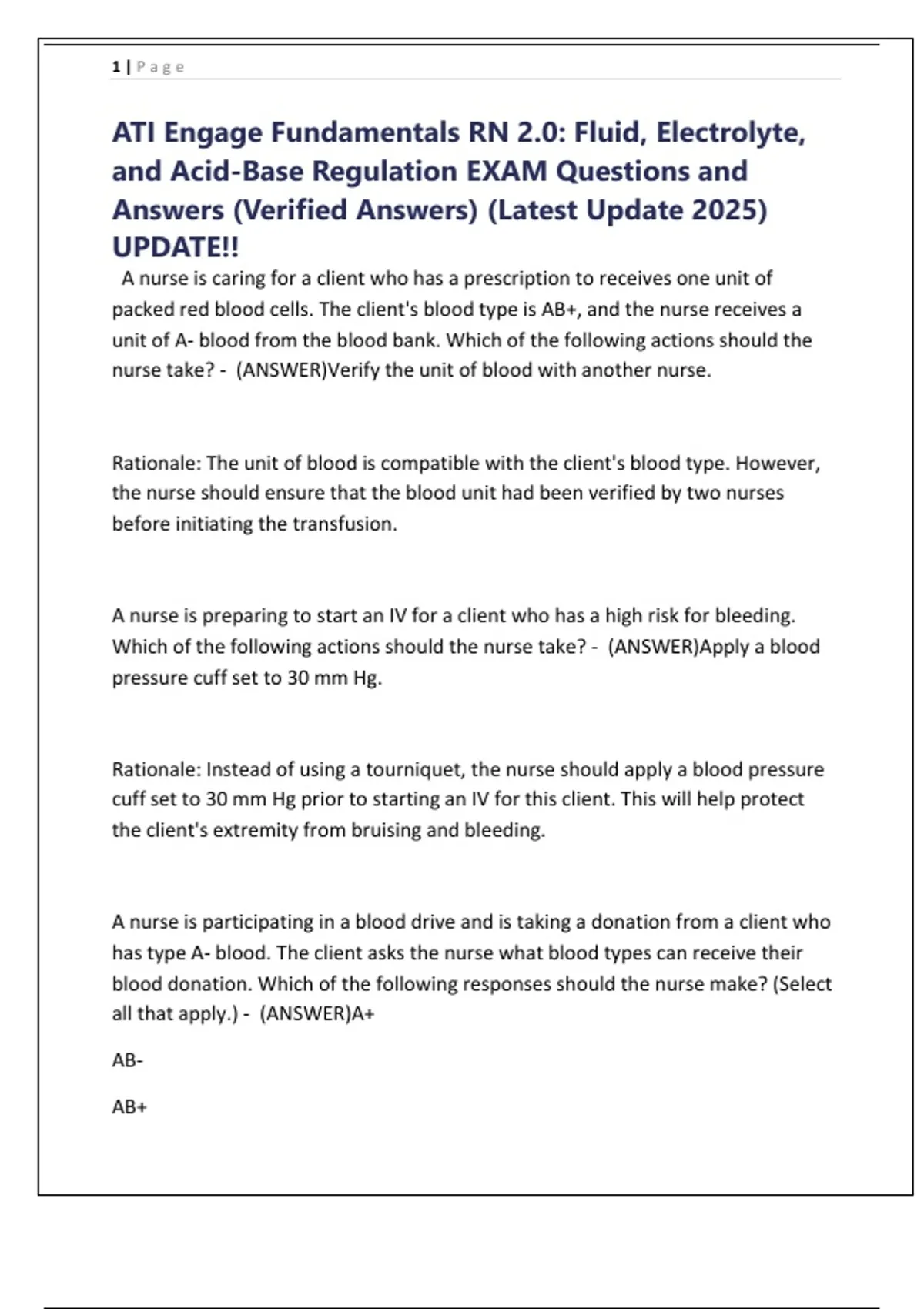 ATI Engage Fundamentals RN 2.0: Fluid, Electrolyte, and Acid-Base Regulation EXAM Questions and Answers (Verified Answers) (Latest Update 2025) UPDATE!!