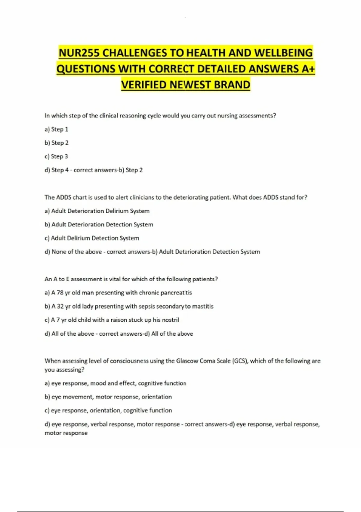 NUR255 CHALLENGES TO HEALTH AND WELLBEING QUESTIONS WITH CORRECT DETAILED ANSWERS A+ VERIFIED NEWEST BRAND In which step of the clinical reasoning cycle would you carry out nursing assessments? a) Step 1 b) Step 2 c) Step 3 d) Step 4 - correct answers-b) Step 2 The ADDS chart is used to alert clinicians to the deteriorating patient. What does ADDS stand for? a) Adult Deterioration Delirium System b) Adult Deterioration Detection System c) Adult Delirium Detection System d) None of the above - correct answers-b) Adult Deterioration Detection System An A to E assessment is vital for which of the following patients? a) A 78 yr old man presenting with chronic pancreatitis b) A 32 yr old lady presenting with sepsis secondary to mastitis c) A 7 yr old child with a raison stuck up his nostril d) All of the above - correct answers-d) All of the above