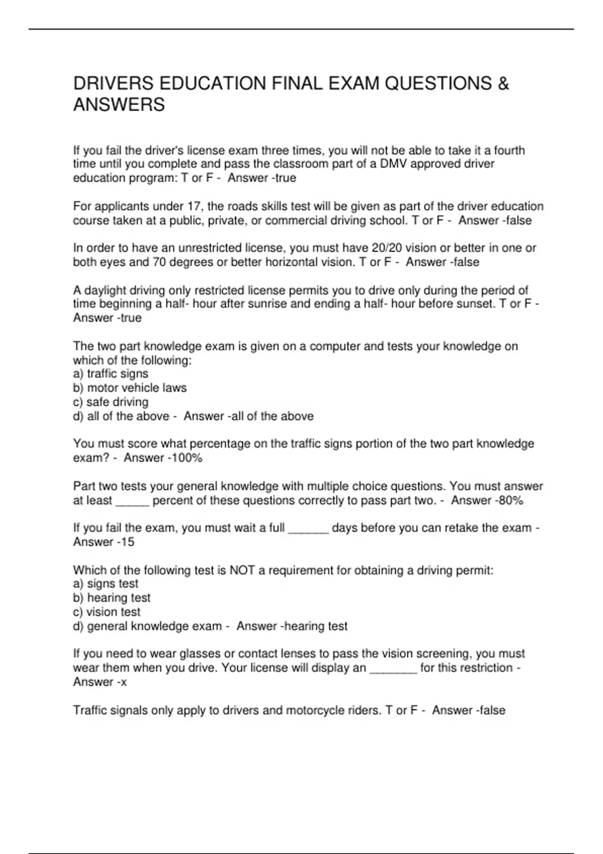 DRIVERS EDUCATION FINAL EXAM QUESTIONS &