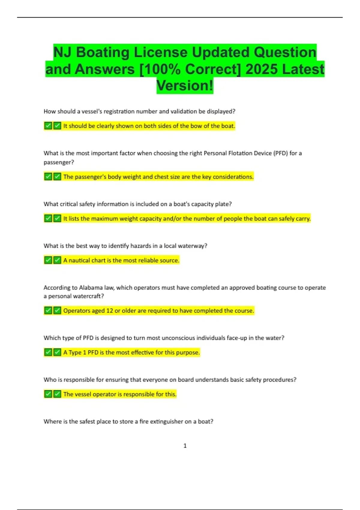 NJ Boating License Updated Question and Answers [100% Correct] 2025 Latest Version! How should a vessel's registration number and validation be displayed? It should be clearly shown on both sides of the bow of the boat. What is the most important factor when choosing the right Personal Flotation Device (PFD) for a passenger? The passenger's body weight and chest size are the key considerations. What critical safety information is included on a boat's capacity plate? It lists the maximum weight capacity and/or the number of people the boat can safely carry. What is the best way to identify hazards in a local waterway? A nautical chart is the most reliable source. According to Alabama law, which operators must have completed an approved boating course to operate a personal watercraft? Operators aged 12 or older are required to have completed the course. Which type of PFD is designed to turn most unconscious individuals face-up in the water? A Type 1 PFD is the most effective for this purpose. Who is responsible for ensuring that everyone on board understands basic safety procedures? The vessel operator is responsible for this. Where is the safest place to store a fire extinguisher on a boat? 1 It should be mounted in a location that is easily accessible. When should a life jacket be replaced? It should be replaced if it is torn or damaged. What impact does alcohol have when operating a vessel? Alcohol increases the likelihood of accidents. What equipment is legally required on an 18-foot boat when operating on federally controlled waters? A U.S. Coast Guard-approved visual distress signal is mandatory. Which sound-producing device is required on Alabama waters when operating an 18-foot powerboat? A whistle, horn, or another similar sound-producing device is necessary. What serves as a warning that dangerous weather conditions may be approaching? Dark clouds and shifting winds often signal such changes. What is a key element of routine vessel and engine maintenance? Checking the oil level before each outing is essential. How should you approach the dock when docking your vessel? Approach against the wind or current, whichever is stronger. What should you do before fueling your boat? Turn off the engine and open all windows, ports, and doors to ensure ventilation. Where should your trailer be positioned when preparing to launch your vessel? It should be positioned far from the boat ramp. 2 How can you avoid propeller strike accidents? The engine should be turned on only when passengers are safely boarding. What is an example of careless operation? Failing to provide enough personal flotation devices on board is a form of careless operation. What is the best way to reduce the risk of drowning while boating? Ensuring everyone wears an appropriate life jacket at all times is key. How can you prevent transporting invasive species on your vessel? Remove any zebra mussels or other visible invasive species before leaving the waterway. What should the vessel operator inform passengers about before departing? The operator should inform passengers of the location of PFDs and distress signals. What is the primary function of an ignition safety switch? It cuts off the engine if the operator is thrown overboard. In Alabama, how far must a vessel stay from a diver-down flag? The distance must be at least 100 feet. How does the effect of alcohol on boating compare to operating on land? The effects are significantly stronger while boating. What is true about boating under the influence in Alabama? Boaters must submit to a blood alcohol test when operating on Alabama waters. 3 4 When two vessels are in close proximity, who is responsible for avoiding a collision? Both operators are responsible for avoiding a collision. How can you tell if you're operating your vessel at a safe speed? You should have enough time to avoid a collision if necessary. According to Alabama law, what constitutes legal operation in a "slow, no wake" zone? Operating at less than 5 mph in these areas is permitted. What is the purpose of the red and green lateral buoys and markers? They mark the edges of safe water channels. When is a sailboat under sail considered the give-way vessel? The sailboat must give way when it is overtaking a power-driven vessel. How can a vessel operator ensure that everyone knows what to do in an emergency? The operator should conduct an emergency drill with passengers. According to Alabama law, what equipment is required when a vessel is towing a skier and lacks a capable observer? A wide-angle rearview mirror is necessary. What does a white marker with an orange crossed diamond and black lettering indicate? It marks an exclusion or restricted area, such as a dam. Why is carbon monoxide gas so dangerous? It is colorless, odorless, tasteless, and can be fatal. 5 When approaching a U.S. naval vessel, at what distance must a recreational vessel slow down? The recreational vessel must slow to minimum speed when within 500 yards of a U.S. naval vessel. What must an operator do before allowing others to operate their vessel? The operator should ensure that they know how to operate the vessel safely. What should you do to minimize the risk of falling overboard? Stay centered in the boat to reduce the chance of falling. What is the first step a boat operator should take when witnessing a boating accident? The operator must offer assistance immediately. What should a motorboat operator do when pulling someone into the boat from the water? The engine should be turned off to ensure safety. Under what condition must a boating accident be reported to the Alabama Marine Police Division? The accident must involve damage to the boat exceeding $2000. What condition poses the greatest risk of hypothermia? Immersion in cold water significantly increases the risk. What should you do immediately if a boat motor catches fire? Shut off the fuel supply and attempt to extinguish the fire using an extinguisher. if your inward/outwar