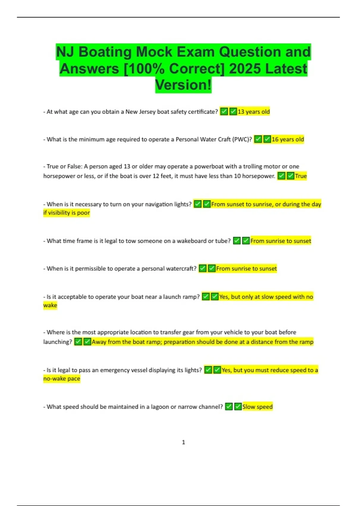NJ Boating Mock Exam Question and Answers [100% Correct] 2025 Latest Version! - At what age can you obtain a New Jersey boat safety certificate? 13 years old - What is the minimum age required to operate a Personal Water Craft (PWC)? 16 years old - True or False: A person aged 13 or older may operate a powerboat with a trolling motor or one horsepower or less, or if the boat is over 12 feet, it must have less than 10 horsepower. True - When is it necessary to turn on your navigation lights? if visibility is poor From sunset to sunrise, or during the day - What time frame is it legal to tow someone on a wakeboard or tube? - When is it permissible to operate a personal watercraft? From sunrise to sunset From sunrise to sunset - Is it acceptable to operate your boat near a launch ramp? wake Yes, but only at slow speed with no - Where is the most appropriate location to transfer gear from your vehicle to your boat before launching? Away from the boat ramp; preparation should be done at a distance from the ramp - Is it legal to pass an emergency vessel displaying its lights? no-wake pace Yes, but you must reduce speed to a - What speed should be maintained in a lagoon or narrow channel? Slow speed 1 - Is it permissible to operate at slow speed inside a marked exclusion area (diamond with a cross)? NEVER enter this area - What distance should you maintain from a military or service vessel? 500 yards - When within 500 yards of a military vessel, what speed should you maintain? speed - If you are within 100 yards of a military vessel, what should you do? Slow, no-wake Stop your boat - When operating at high speed, how far must you stay from a marina, pier, wharf, or dock? At least 200 feet - When within 200 feet of a marina, pier, wharf, or dock, what speed should you go? No wake, slow speed - What should you check before departing from the dock? - What does a Nautical Chart provide? Nautical Chart It includes details on water depths and the locations of channels, sandbars, rocks, and vegetation to help avoid running aground - What can help you avoid running aground? Nautical Chart - Who is responsible for preventing collisions? Everyone - When two boats approach each other head-on, what should happen? to the right to pass safely - If another boat approaches from your starboard side, what should you do? down, or change direction (as the give-way vessel) Both boats must give way You must stop, slow 2 - When a sailboat is overtaking your vessel, what action should you take? and speed, as the sailboat is the give-way vessel Maintain your course - True or False: When overtaking another boat, you must yield the right of way. True - What is the main factor that influences boat speed? Visibility - If you find yourself in fog, what should you do? ready to take action to avoid a collision Slow down, turn on navigation lights, and be - Red buoys: Are they even or odd numbered? Even - Green buoys: Are they even or odd numbered? - What is the purpose of markers? Odd They indicate the edges of safe water, where running aground is a risk outside them - If you run aground, what should you do first? - After running aground, what steps should you take? Ensure everyone's safety and offer assistance Check everyone's condition, inspect for leaks, turn off the engine, shift weight forward, raise the engine, and use a boat hook or oar to push the boat free - Do you need to register your boat annually? Yes - Where should validation decals be placed? boat's bow Next to the registration numbers on both sides of the - Where are registration numbers located on a boat? On both sides of the boat’s bow 3 - Where will you find the hull identification number? transom On the starboard side of the stern or - What is a mandatory Coast Guard item for boats in federally controlled waters? distress signals - What types of approved visual distress signals are there? Approved visual Flare, SOS light, red meteors, or distress flags - What is required on all boats? Life jackets, fire extinguishers, whistle, and horn - What speed should you maintain when approaching a dock? Slow speed - Should you approach a dock by going with or against the wind or current? current - What steps should be taken before fueling your boat? Against the wind or 1. Remove everyone from the boat 2. Ensure all equipment is turned off, including electrical devices 3. Close all windows, doors, ports, and openings 4. Remove portable fuel tanks and fill them on the dock 5. Keep a fire extinguisher on hand - What actions should you take after fueling your boat? openings 2. Wipe up any fuel spills 3. Check the bilge and engine for fuel vapors 1. Open all windows, doors, ports, and 4. Allow the boat to ventilate for 4 minutes before restarting the engine 4 - How can you prevent the spread of invasive species? Thoroughly clean your boat and trailer, removing any plants or animals, such as zebra mussels, you find. What is the age that you MUST wear a PFD at all times? If you are out on the water what have you given consent to? What happens if you operate a boat under the influence? driving for three months 12 or younger An alcohol or drug test Lost boating license for a year and Towing vessels must have _________ to watch the person being towed PWC or boat requires to have at least how many people aboard? What are you required to have when you are towing someone? a competent observer 3 people Ski Tow Flag Where should the ski tow flag be placed? 4 feet above the highest part of the vessel and must be displayed when towing someone behind your vessel When must accidents be reported to the NJ state police? property damage is more than $2,000 Slow Speed/No Wake If a person disappears, dies, injury, or The speed at which a motorized vessel moves through the water and is able to maintain minimum headway in relation to a vessel or structure being passed and produces the minimum wake possible. What does a PWC need to steer? What is minimum headway speed? Power The slowest spee