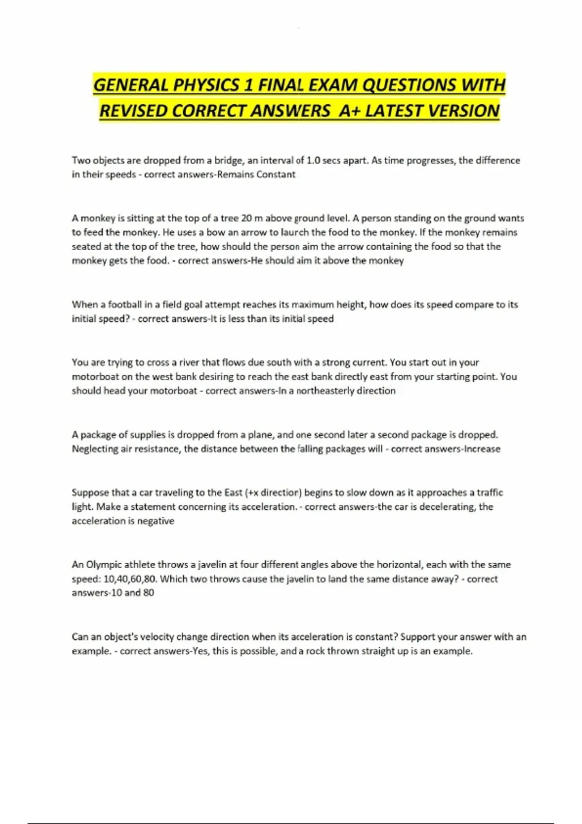 GENERAL PHYSICS 1 FINAL EXAM QUESTIONS WITH REVISED CORRECT ANSWERS A+ LATEST VERSION Two objects are dropped from a bridge, an interval of 1.0 secs apart. As time progresses, the difference in their speeds - correct answers-Remains Constant A monkey is sitting at the top of a tree 20 m above ground level. A person standing on the ground wants to feed the monkey. He uses a bow an arrow to launch the food to the monkey. If the monkey remains seated at the top of the tree, how should the person aim the arrow containing the food so that the monkey gets the food. - correct answers-He should aim it above the monkey When a football in a field goal attempt reaches its maximum height, how does its speed compare to its initial speed? - correct answers-It is less than its initial speed You are trying to cross a river that flows due south with a strong current. You start out in your motorboat on the west bank desiring to reach the east bank directly east from your starting point. You should head your motorboat - correct answers-In a northeasterly direction