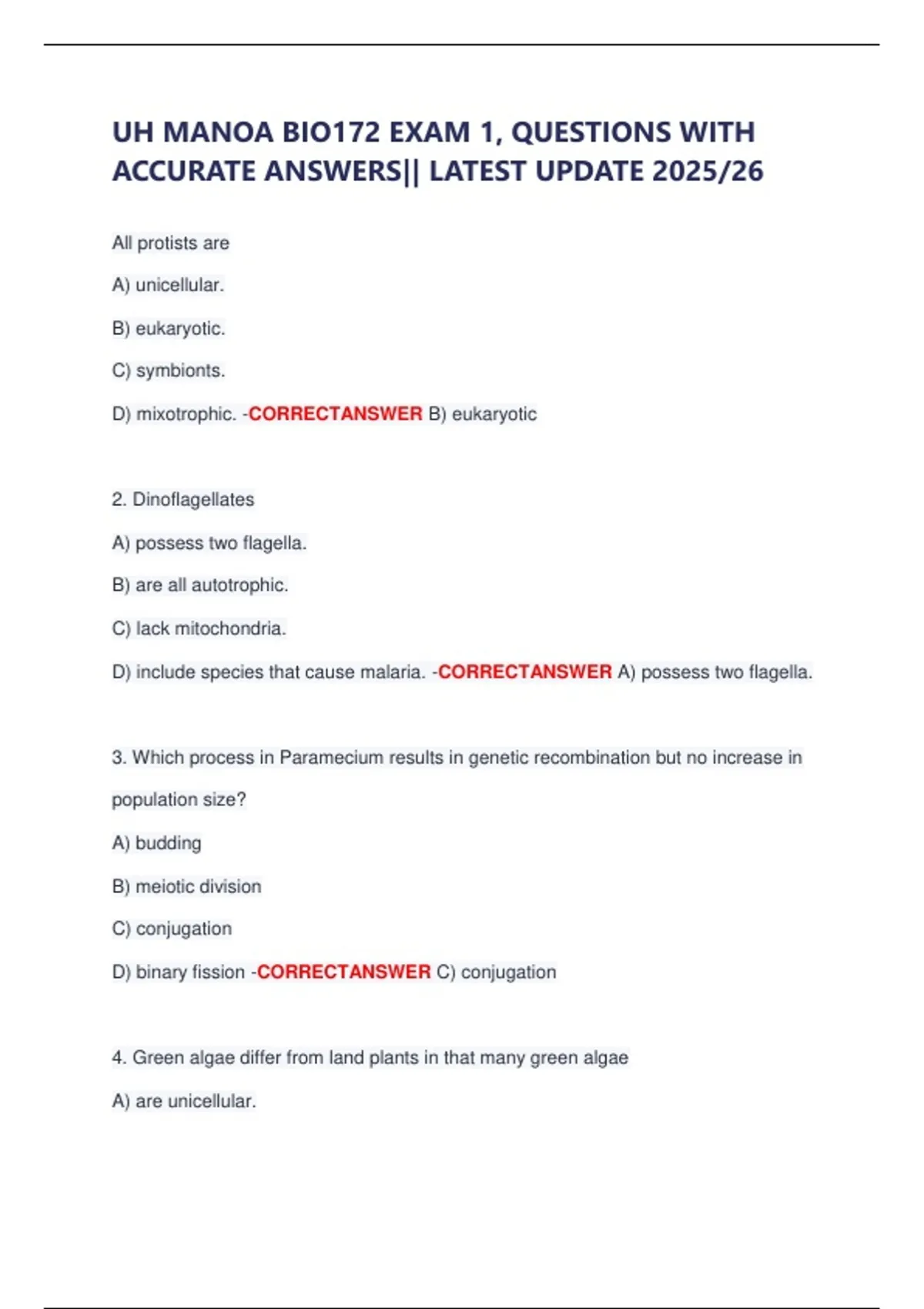 UH MANOA BIO172 EXAM 1, QUESTIONS WITH ACCURATE ANSWERS|| LATEST UPDATE 2025/26