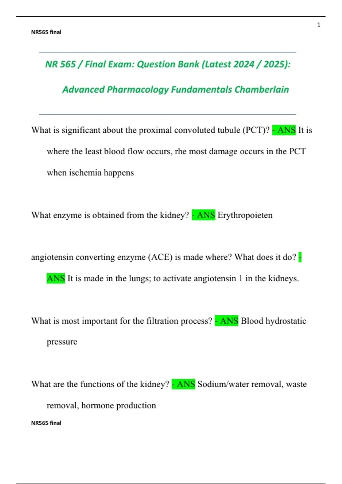This document presents the latest 2024–2025 edition of the NR 565 – Advanced Pharmacology Fundamentals Final Exam Question Bank from Chamberlain University, featuring verified questions and correct answers. It is designed to help nursing and nurse practitioner students prepare for their final pharmacology exam by covering critical topics such as pharmacokinetics, pharmacodynamics, drug classifications, therapeutic applications, and clinical decision-making. The guide serves as a comprehensive and reliable study resource for mastering advanced pharmacological principles essential for success in graduate-level nursing programs.What is significant about the proximal convoluted tubule (PCT)? - ANS It is where the least blood flow occurs, rhe most damage occurs in the PCT when ischemia happens What enzyme is obtained from the kidney? - ANS Erythropoieten angiotensin converting enzyme (ACE) is made where? What does it do? - ANS It is made in the lungs; to activate angiotensin 1 in the kidneys. What is most important for the filtration process? - ANS Blood hydrostatic pressure