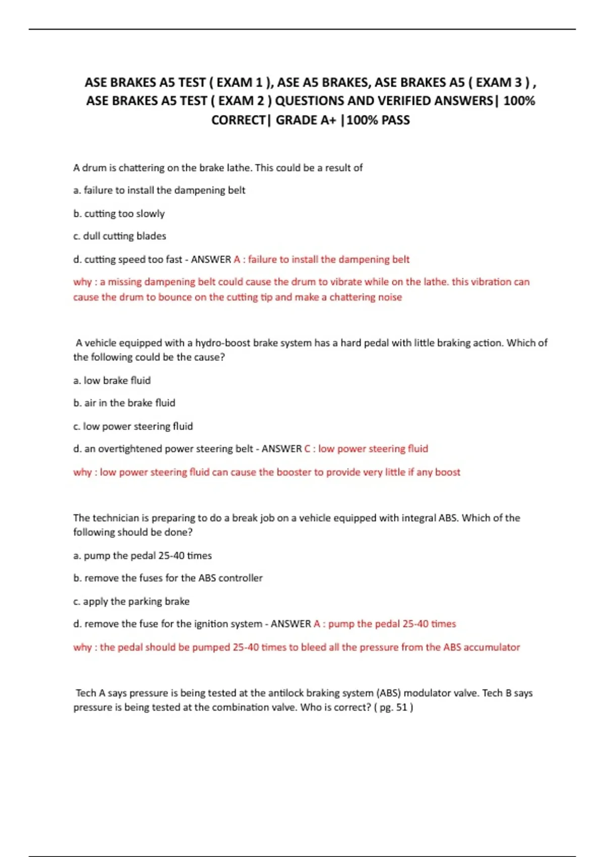 ASE BRAKES A5 TEST ( EXAM 2 ) QUESTIONS AND VERIFIED ANSWERS| 100%