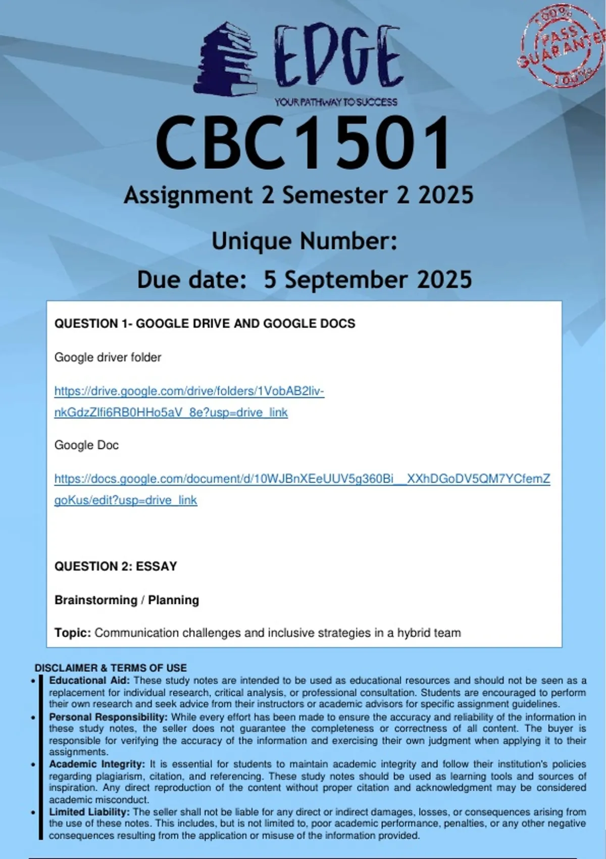 Well-structured CBC1501 Assignment 2 (ANSWERS) Semester 2 2025 - DISTINCTION GUARANTEED. (DETAILED ANSWERS - DISTINCTION GUARANTEED!)..... You must read the following case study before answering questions 2–4: “Lost in Translation: Navigating Barriers to Listening and Communication Styles in a Hybrid Team” Saim Waqas, a junior marketing coordinator at Accenture Accounting, was born with a severe hearing impairment. He has only 20% hearing in his right ear and 10% in his left ear. He, therefore, relies on hearing aids, lip-reading, captioned video calls, and written communication to participate in workplace interactions. Saim’s team recently began a high-pressure marketing campaign for a high-profile client. The project is coordinated through a hybrid format: • Weekly in-person meetings in the office • Daily updates via group chat on Microsoft Teams • Brainstorming sessions on video calls with screen sharing • Document collaboration in Google Workspace From the outset, Saim encountered several communication challenges: • In video meetings, some colleagues failed to switch on their cameras or position themselves clearly, making lip-reading impossible. Others spoke while muted or during screen sharing, preventing Saim from following along. • In group chats, colleagues posted multiple quick messages without tagging him, making it difficult to follow the conversation thread, while some colleagues posted emoticons that Saim could not understand. • In-person meetings often became fast-paced, with overlapping speech and limited turn-taking. Moreover, background sounds such as the buzzing of the projector and air conditioner caused interference in Saim’s hearing aids, resulting in severe headaches. • Technical jargon and unexplained acronyms were used in both verbal and written exchanges, which intensified the challenges the Saim experienced. Team members’ communication styles added complexity: • Priya is an open communicator, readily sharing updates and asking questions, but sometimes overshares personal matters, which others find distracting. • Andre is a blind communicator, confident in his clarity but often unaware that his rushed speech and lack of captions exclude Saim from key details. • Lerato is a hidden communicator, careful about what she says and prefers private messages, which means important information is sometimes not shared with the group. • Tebogo is a closed communicator, resistant to collaboration tools, preferring face-to-face discussion only, and often reluctant to engage in group chats. Page 8 of 16 A misunderstanding during the final client pitch preparation, where Saim received incomplete design instructions via chat, resulted in a significant error. Andre publicly criticised Saim for “not listening properly” during a video meeting, which embarrassed him in front of the group. Saim felt this was unfair, as he had repeatedly asked for clarification in the chat and meetings. The team leader, realising that poor communication and lack of inclusivity were creating conflict, scheduled a facilitated session to address: • Listening barriers (both physical and psychological) • Inclusive communication practices in hybrid teams • How communication styles affect collaboration and conflict resolution Page 9 of 16 4. QUESTION 2: ESSAY [30] 4.1. Instructions TO STUDY: LUs 1-11. Read the case study provided on page 6, then complete the following task. You are now going to apply all the theories that you have learnt about persuasive writing and communication. Using the case study “Lost in Translation: Navigating Barriers to Listening and Communication Styles in a Hybrid Team”, write an essay of 700 words where you describe the communication challenges faced by Saim Waqas in a hybrid workplace. You will explore listening and hearing, barriers to effective communication, non-verbal communication in spoken and written contexts, and how different communication styles can influence conflict and teamwork. Finally, you will propose practical strategies for improving inclusive communication. 4.2. Essay Structure: Your essay should be structured as follows: I. Introduction (full paragraph) II. Body (six paragraphs). Each paragraph should contain: • One clear topic sentence that introduces the main idea. • Two substantiating statements that explain, illustrate, or support the topic sentence with examples from the case study. The six paragraphs in the body should cover the following topics: i. Overview of Saim’s communication challenges in the hybrid team. ii. The difference between hearing and listening. iii. Any two barriers to listening that are present in the case study. iv. Any two categories of non-verbal communication in spoken contexts and any two categories of non-verbal communication in written contexts. v. Any two functions of non-verbal communication that are apparent in the scenario, and their impact on understanding. vi. Any two practical strategies the team could use to improve communication and teamwork with Saim. III. Conclusion (full paragraph) Page 10 of 16 4.3. Presentation requirements This content outline should guide you when planning your essay for this assessment. i. An appropriate title ii. The brainstorming/planning iii. The introduction should include a thesis statement that highlights the different aspects of the topic to be discussed. iv. Six topic sentences with six substantiating points (that are cited correctly) in the body. a. One topic sentence with two substantiating statements for each paragraph. This means that you will have six paragraphs, each with one topic sentence and two referenced substantiating statements. b. You MUST reference the substantiating statements using the correct in-text referencing styles and provide a list of sources consulted that should be placed at the end of the assignment. c. Peruse three additional resources of your choice, in addition to the study material provided to you. v. T