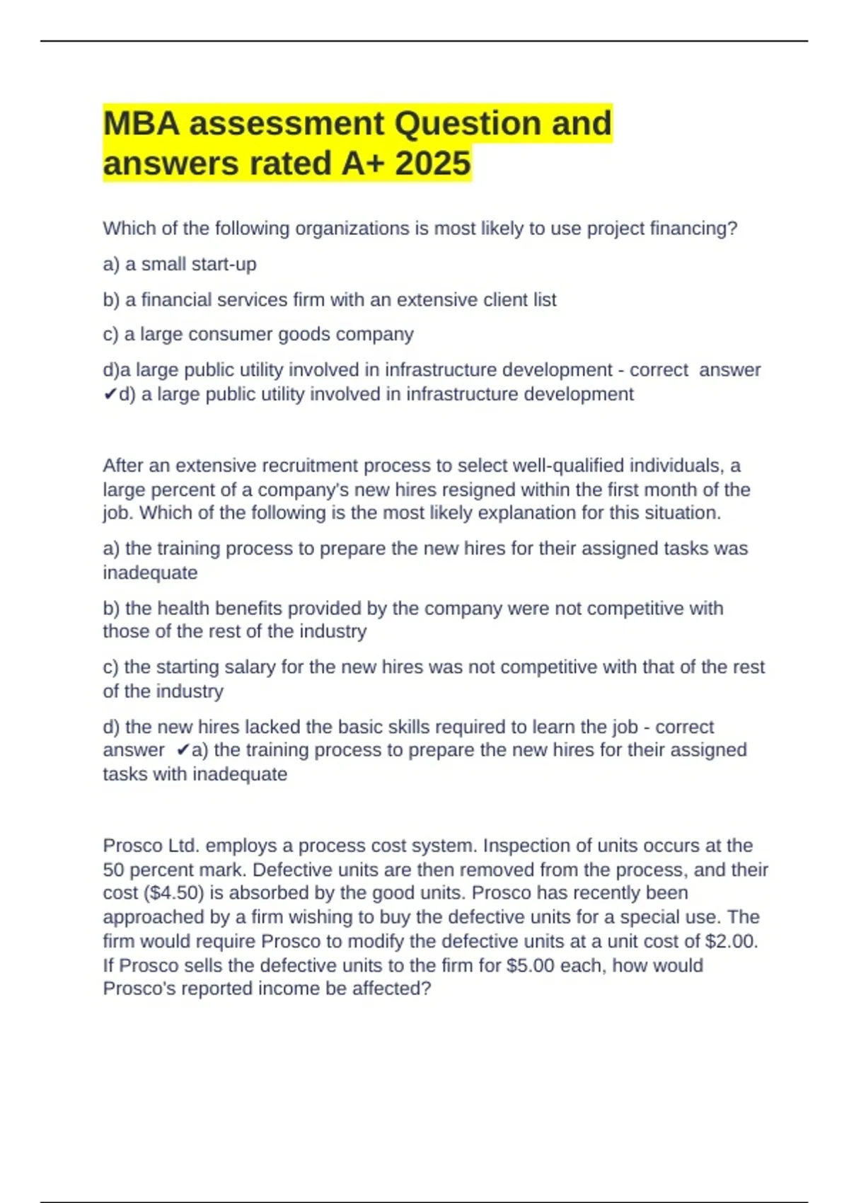 MBA assessment Question and answers rated A+ 2025 Which of the following organizations is most likely to use project financing? a) a small start-up b) a financial services firm with an extensive client list c) a large consumer goods company d)a large public utility involved in infrastructure development - correct answer d) a large public utility involved in infrastructure development After an extensive recruitment process to select well-qualified individuals, a large percent of a company's new hires resigned within the first month of the job. Which of the following is the most likely explanation for this situation. a) the training process to prepare the new hires for their assigned tasks was inadequate b) the health benefits provided by the company were not competitive with those of the rest of the industry c) the starting salary for the new hires was not competitive with that of the rest of the industry d) the new hires lacked the basic skills required to learn the job - correct answer a) the training process to prepare the new hires for their assigned tasks with inadequate Prosco Ltd. employs a process cost system. Inspection of units occurs at the 50 percent mark. Defective units are then removed from the process, and their cost ($4.50) is absorbed by the good units. Prosco has recently been approached by a firm wishing to buy the defective units for a special use. The firm would require Prosco to modify the defective units at a unit cost of $2.00. If Prosco sells the defective units to the firm for $5.00 each, how would Prosco's reported income be affected? (A) It would decrease by $4.50 per unit sold. (B) It would decrease by $1.50 per unit sold. (C) It would increase by $3.00 per unit sold. (D) It would increase by $5.0
