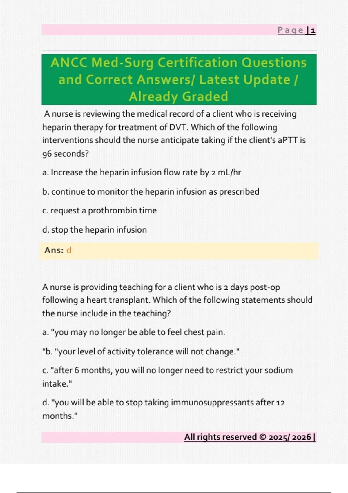 ANCC Med-Surg Certification Questions and Correct Answers 2025/2026/ANCC Med-Surg Certification Questions and Correct Answers 2025/2026