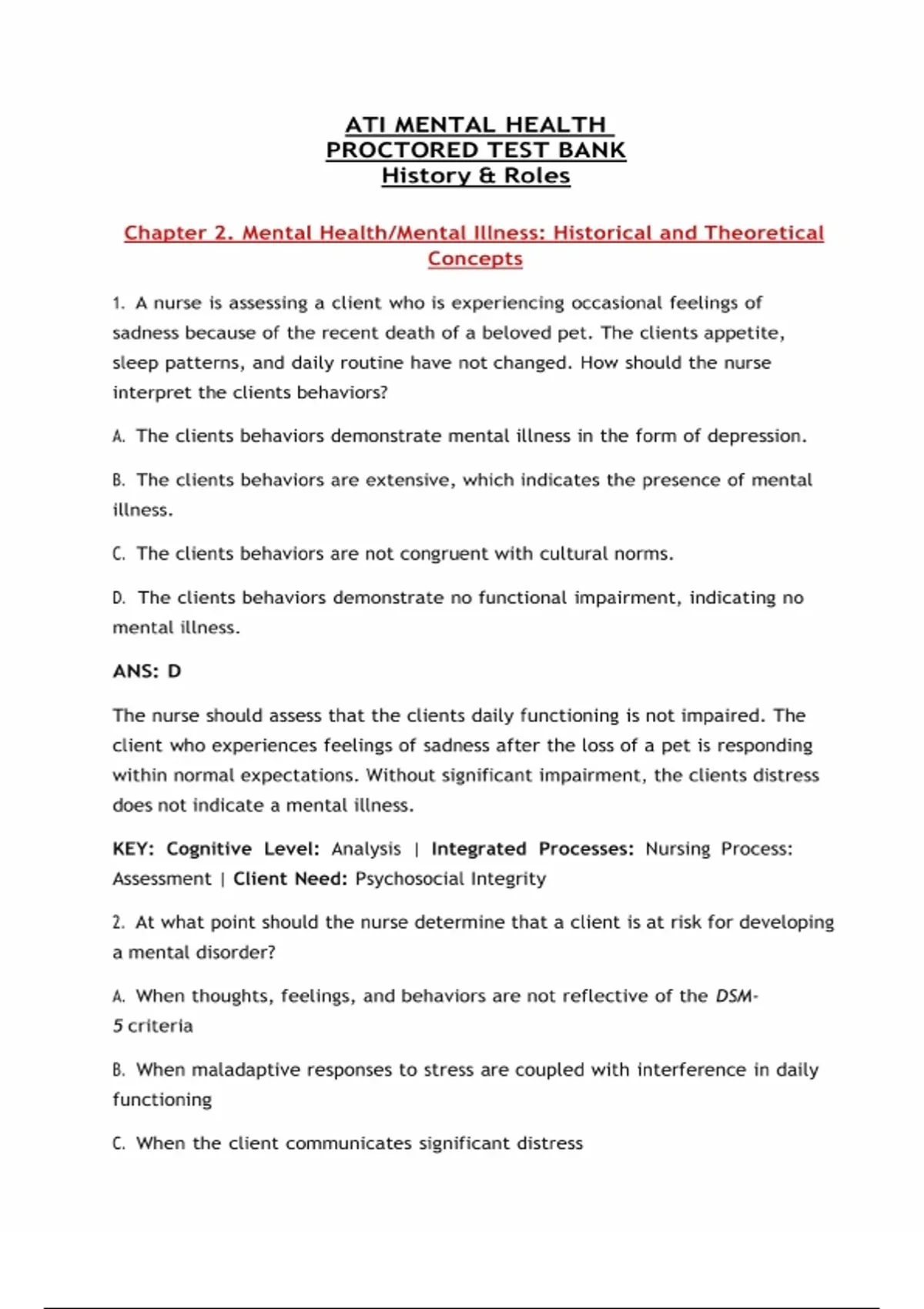 TEST BANK FOR ATI MENTAL HEALTH PROCTORED (History & Roles)