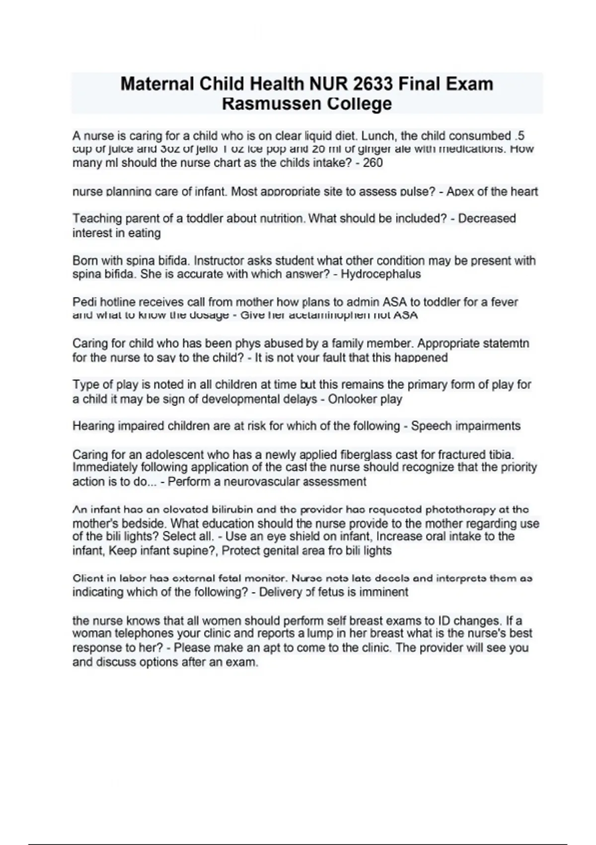 Maternal Child Health NUR 2633 Final Exam Rasmussen College