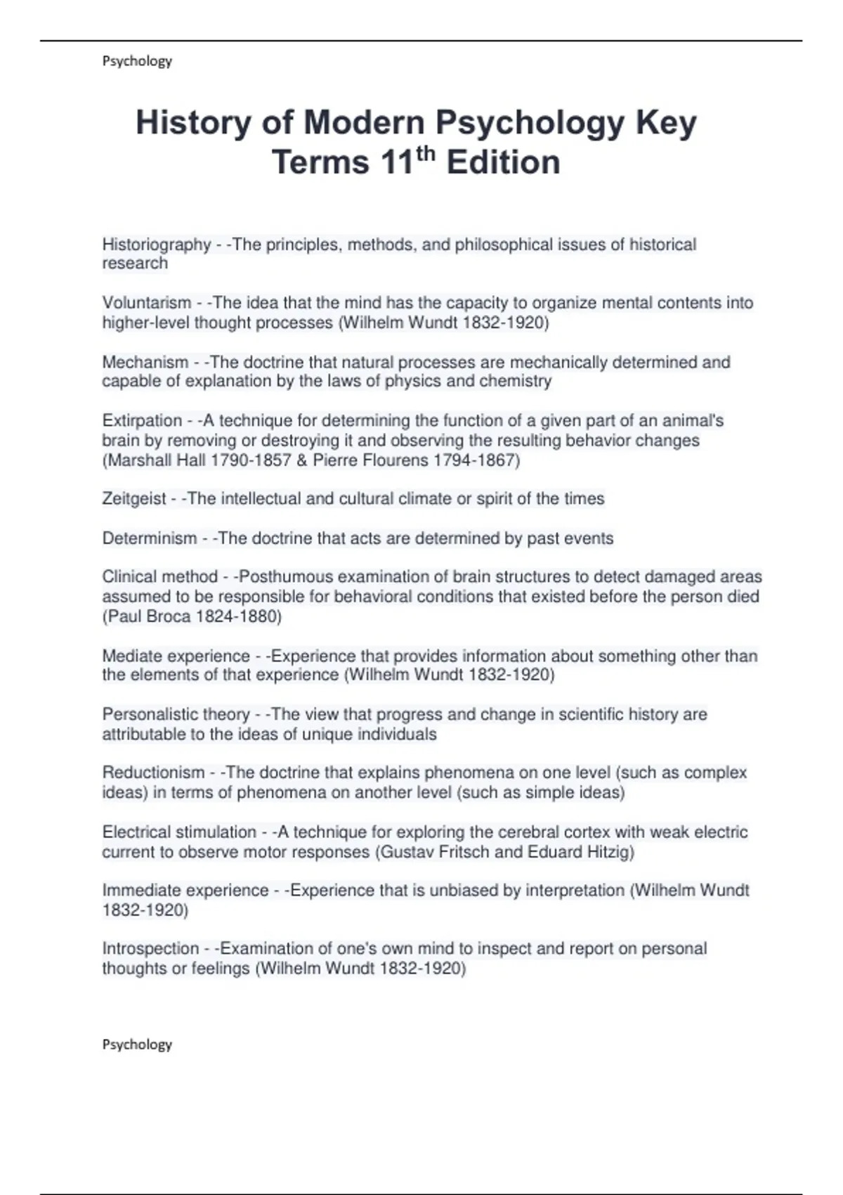 History of Modern Psychology Key Terms 11th Edition Historiography - -The principles, methods, and philosophical issues of historical research Voluntarism - -The idea that the mind has the capacity to organize mental contents into higher-level thought processes (Wilhelm Wundt ) Mechanism - -The doctrine that natural processes are mechanically determined and capable of explanation by the laws of physics and chemistry Extirpation - -A technique for determining the function of a given part of an animal's brain by removing or destroying it and observing the resulting behavior changes (Marshall Hall & Pierre Flourens ) Zeitgeist - -The intellectual and cultural climate or spirit of the times Determinism - -The doctrine that acts are determined by past events Clinical method - -Posthumous examination of brain structures to detect damaged areas assumed to be responsible for behavioral conditions that existed before the person died (Paul Broca ) Mediate experience - -Experience that provides information about something other than the elements of that experience (Wilhelm Wundt ) Personalistic theory - -The view that progress and change in scientific history are attributable to the ideas of unique individuals Reductionism - -The doctrine that explains phenomena on one level (such as complex ideas) in terms of phenomena on another level (such as simple ideas) Electrical stimulation - -A technique for exploring the cerebral cortex with weak electric current to observe motor responses (Gustav Fritsch and Eduard Hitzig) Immediate experience - -Experience that is unbiased by interpretation (Wilhelm Wundt ) Introspection - -Examination of one's own mind to inspect and report on personal thoughts or feelings (Wilhelm Wundt ) Psychology Psychology Two-point threshold - -The threshold at which two points of stimulation can be distinguished as such (Ernst Weber ) Empiricism - -The pursuit of knowledge through the observation of nature and the attribution of all knowledge to experience Naturalistic theory - -The view that progress and change in scientific history are attributable to the Zeitgeist, which makes a culture receptive to some ideas, but not to others Structuralism - -E.B. Titchener's system of psychology, which dealt with conscious experience as dependent on experiencing persons Mind-body problem - -The question of the distinction between mental and physical qualities (René Descartes, ) Just noticeable difference - -The smallest difference that can be detected between two physical stimuli (Ernst Weber ) Tridimensional theory of feelings - -Wundt's explanation for feeling states based on three dimensions: pleasure/displeasure, tension/relaxation, and excitement/depression (Wilhelm Wundt ) Functionalism - -A system of psychology concerned with the mind as it is used in an organism's adaptation to its environment Reflex action theory - -The idea that an external object (a stimulus) can bring about an involuntary response (René Descartes, ) Absolute threshold - -The point of sensitivity below which no sensations can be detected and above which sensations can be experienced (Gustav Theodor Fechner ) Apperception - -The process by which mental elements are organized (Wilhelm Wundt ) Nonsense syllables - -Syllables presented in a meaningless series to study memory processes (Hermann Ebbinghaus ) Behaviorism - -Watson's science of behavior, which dealt solely with observable behavioral acts that could be described in objective terms Differential threshold - -The point of sensitivity at which the least amount of change in a stimulus gives rise to a change in sensation (Gustav Theodor Fechner ) Derived ideas - -Ideas that are produced by the direct application of an external stimulus (René Descartes, ) Psychology Psychology Gestalt psychology - -A system of psychology that focuses largely on learning and perception, suggesting that combining sensory elements produces new patterns with properties that did not exist in the individual elements Innate ideas - -Ideas that arise from the mind or consciousness, independent of sensory experiences or external stimuli (René Descartes, ) Psychophysics - -The scientific study of the relations between mental and physical processes (Gustav Theodor Fechner ) Act psychology - -Brentano's system of psychology, which focused on mental activities (for example, seeing) rather than on mental contents (for example, that which is seen) (Franz Brentano ) Psychoanalysis - -Sigmund Freud's theory of personality and system of psychotherapy Positivism - -The doctrine that recognizes only natural phenomena or facts that are objectively observable (Auguste Comte, ) - - Phenomenology - -Stumpf's introspective method that examined experience as it occurred and did not try to reduce experience to elementary components; also, an approach to knowledge based on an unbiased description of immediate experience as it occurs, not analyzed or reduced to elements (Carl Stumpf ) Systematic experimental introspection - -Kulpe's introspective m