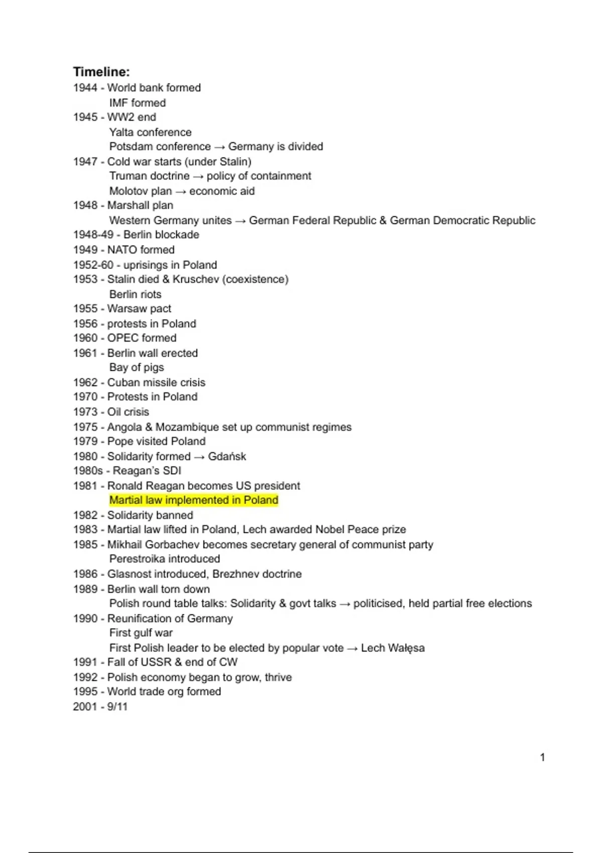 This is a summary of the 1980's-90's time period leading up to and following the end of the Cold War. Contains a timeline of all the most important events, and then elaborates on all those events. Included: Context, Gorbachev's aims and reforms, the New World Order and Globalisation, the effect on the developing world (including BRICS), and a case study on Poland. This summary breaks down the topics in a way that is easy to memorise and also builds understanding of the relevance of the events.