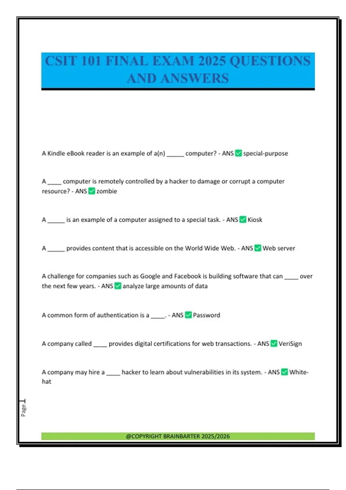 A Kindle eBook reader is an example of a(n) _____ computer? - ANS special-purpose A ____ computer is remotely controlled by a hacker to damage or corrupt a computer resource? - ANS zombie A _____ is an example of a computer assigned to a special task. - ANS Kiosk A _____ provides content that is accessible on the World Wide Web. - ANS Web server A challenge for companies such as Google and Facebook is building software that can ____ over the next few years. - ANS analyze large amounts of data A common form of authentication is a ____. - ANS Password A company called ____ provides digital certifications for web transactions. - ANS VeriSign A company may hire a ____ hacker to learn about vulnerabilities in its system. - ANS White- hat @COPYRIGHT BRAINBARTER 2025/2026 Page2 A concern over heavy use of ____ is that it may desensitize the individual to the reality of the real world. - ANS violent, interactive simulated games A game console relies on a fast _____ to handle the lively animations in a video game. - ANS microprocessor A popular encryption method used to protect data that travels over a wireless network is ____. - ANS WPA A popular term used to identify devices such as the iPad is _____. - ANS Tablet PC A printer requires a ____ installed on the computer in order to operate. - ANS Device Driver A(n) ____ certificate confirms your credentials when conducting business or other transactions on the web. - ANS SSL A(n) ____ lifestyle involves ridding oneself of all concerns about privacy. - ANS Transparent A(n) ____ view of data is the way a user thinks about data. - ANS Logical AI applications are ways in which AI methodologies are applied to ____ and provide services. - ANS Solves Problems All of the following