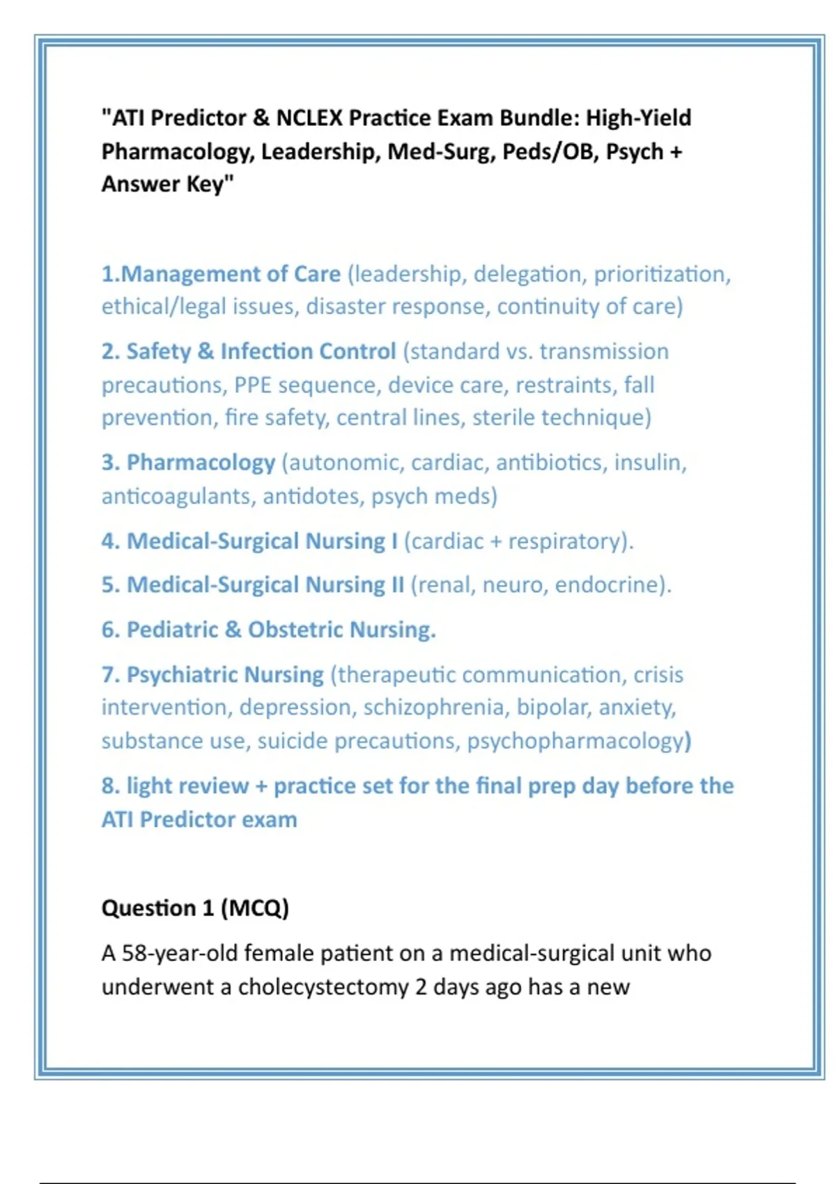 { "titles": [ "ATI Predictor Practice Exam & NCLEX Review", "NCLEX Management of Care Practice Questions", "Comprehensive ATI Predictor Practice Exam & Remediation", "ATI Review & NCLEX Prep: Master All Core Nursing Topics", "Ultimate NCLEX Practice Exam & ATI Predictor Review with Targeted Remediation", "Master the ATI Predictor and NCLEX with a Comprehensive, Full-Length Practice Exam" ], "short_description": "Overcome exam anxiety and prepare with precision. This full-length ATI Predictor and NCLEX Practice Exam is your secret weapon for success. We know the stress of final exams and the fear of the NCLEX, which is why this resource is designed to build your confidence and target your weaknesses. The content is meticulously aligned with the latest ATI Predictor blueprint and core NCLEX-RN categories. Identify your knowledge gaps with our targeted remediation sprints and strengthen your test-taking stamina with a full-length, timed practice exam. This isn't just a test; it's an efficient review system that guides your study, ensuring every minute counts. Gain the insights you need to walk into your exam feeling prepared and empowered.", "medium_description": "This comprehensive practice exam is ideal for nursing students preparing for the ATI Predictor or seeking a highly efficient, targeted review for the NCLEX-RN. It is specifically designed to help you consolidate knowledge across all critical domains and build the confidence necessary to pass. The product includes a full-length, timed practice exam that mirrors the format and question difficulty of the actual tests, with questions covering Management of Care, Safety & Infection Control, Pharmacology, Med-Surg, Peds & OB, and Psych. Key features of this review system include a full exam to simulate test day conditions and assess your current readiness, followed by targeted remediation sprints which provide focused study guidance based on your performance. A light review section is also included for quick confidence-building sessions. This resource will guide you through crucial topics such as delegation, prioritization (ABCs, Maslow), common drug classes, EKG basics, and therapeutic communication. The practice exam and its associated study materials are provided as a downloadable PDF with a printable answer key and detailed rationales for every question. Invest in your future and walk into your exam with confidence. Download now!", "hashtags": [ "#ati_predictor", "#nclex_review", "#nursing_student", "#practice_exam", "#management_of_care", "#nclex_prep", "#nursing_school", "#ati_review", "#medsurg_nursing", "#pharmacology_review" ], "seo_keywords": [ "ATI Predictor practice questions", "NCLEX leadership delegation", "pharmacology review nursing", "management of care NCLEX", "ATI final exam review", "nursing school study guide", "prioritization and delegation NCLEX", "nursing practice exam" ] }