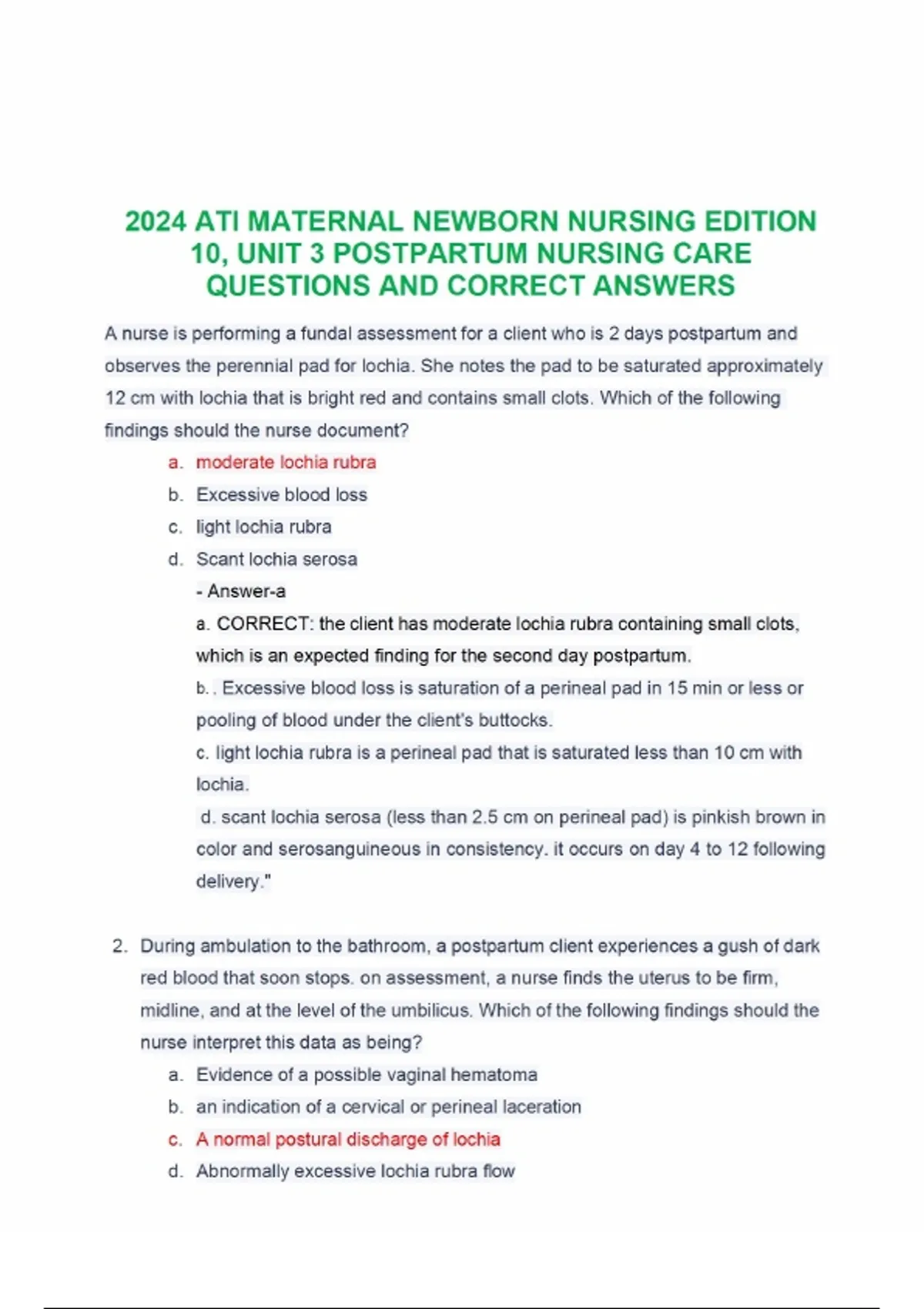 2024 ATI MATERNAL NEWBORN NURSING EDITION 10, UNIT 3 POSTPARTUM
