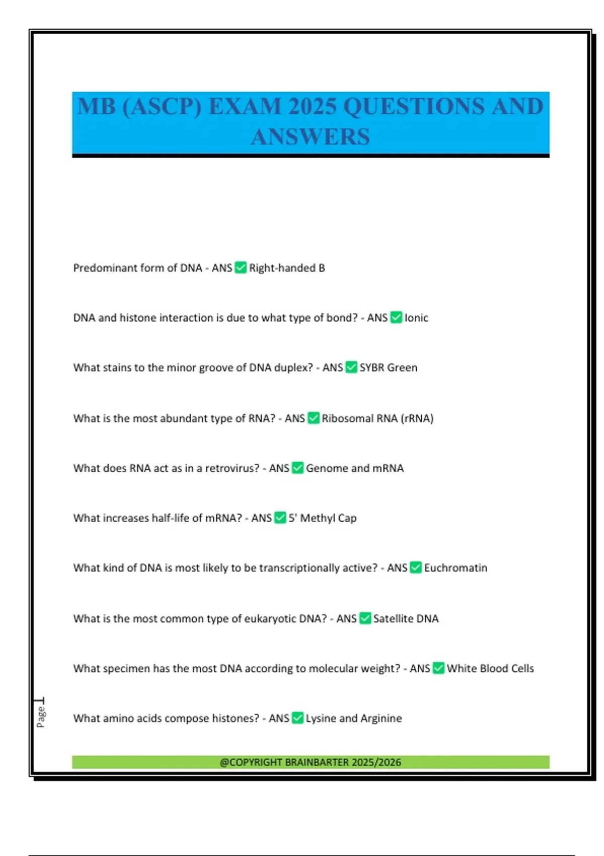 Predominant form of DNA - ANS Right-handed B DNA and histone interaction is due to what type of bond? - ANS Ionic What stains to the minor groove of DNA duplex? - ANS SYBR Green What is the most abundant type of RNA? - ANS Ribosomal RNA (rRNA) What does RNA act as in a retrovirus? - ANS Genome and mRNA What increases half-life of mRNA? - ANS 5' Methyl Cap What kind of DNA is most likely to be transcriptionally active? - ANS Euchromatin What is the most common type of eukaryotic DNA? - ANS Satellite DNA What specimen has the most DNA according to molecular weight? - ANS White Blood Cells What amino acids compose histones? - ANS Lysine and Arginine @COPYRIGHT BRAINBARTER 2025/2026 Page2 Amino acid that all proteins start with: - ANS Methionine What protects the DNA strand during replication? - ANS Single-stranded binding protein Leading Strand - ANS 3' to 5' template Lagging Strand - ANS 5' to 3' template What DNA strand is being copied in transcription? - ANS Antisense Strand First step after newly formed mRNA is made? - ANS Addition of poly(A) tail Every time the chromosome is copied it would become shorter if not for what enzyme? - ANS Telomerase What polymerase has repair activity? - ANS Beta/Epsilon What polymerase acts on leading strand? - ANS Delta What polymerase acts on lagging strand? - ANS Alpha Which polymerase is used for mitochondrial replication and repair? - ANS Gamma What polymerase binds the 5' end to 3' end of dsDNA? - ANS Topoisomerase Which RNA poly
