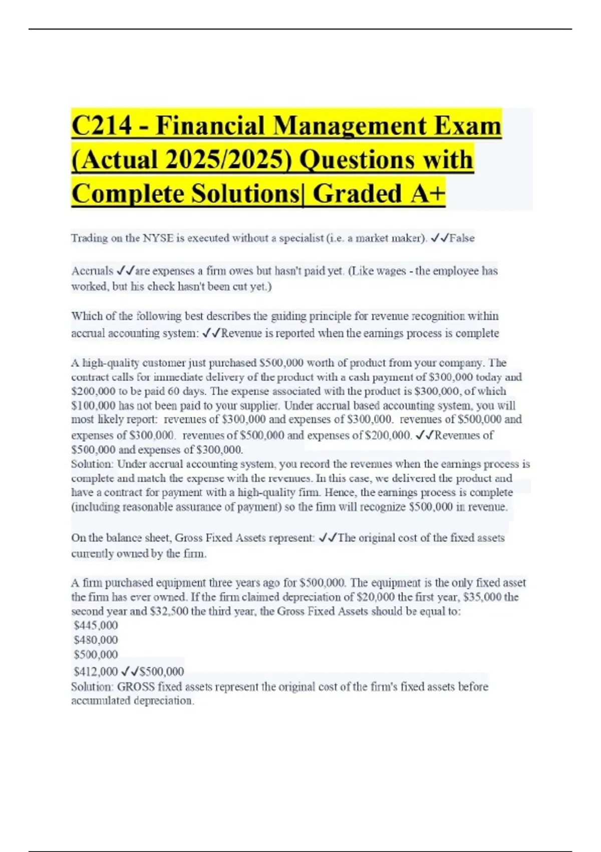 C214 - Financial Management Exam (Actual 2025/2025) Questions with Complete Solutions| Graded A+