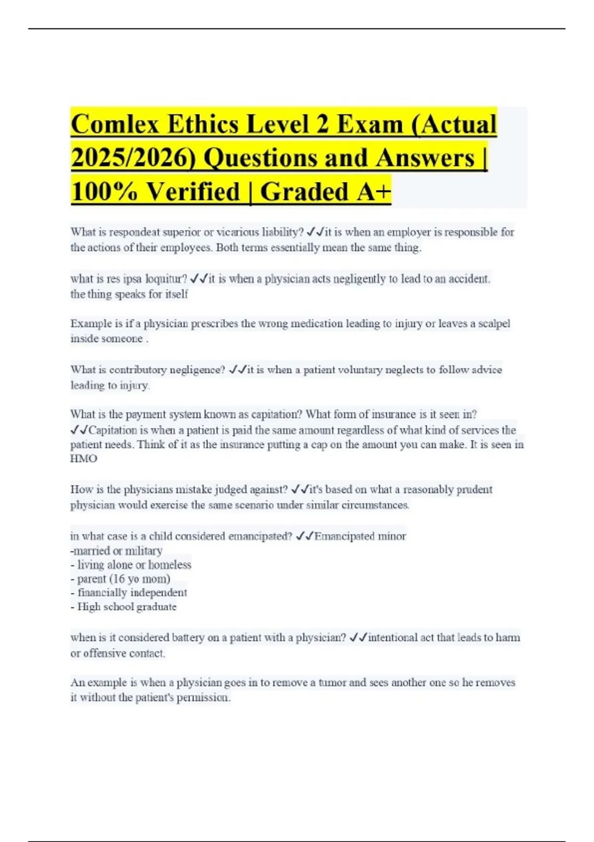 Comlex Ethics Level 2 Exam (Actual 2025/2026) Questions and Answers | 100% Verified | Graded A+ What is respondeat superior or vicarious liability? it is when an employer is responsible for the actions of their employees. Both terms essentially mean the same thing. what is res ipsa loquitur? it is when a physician acts negligently to lead to an accident. the thing speaks for itself Example is if a physician prescribes the wrong medication leading to injury or leaves a scalpel inside someone . What is contributory negligence? it is when a patient voluntary neglects to follow advice leading to injury. What is the payment system known as capitation? What form of insurance is it seen in? Capitation is when a patient is paid the same amount regardless of what kind of services the patient needs. Think of it as the insurance putting a cap on the amount you can make. It is seen in HMO How is the physicians mistake judged against? it's based on what a reasonably prudent physician would exercise the same scenario under similar circumstances.
