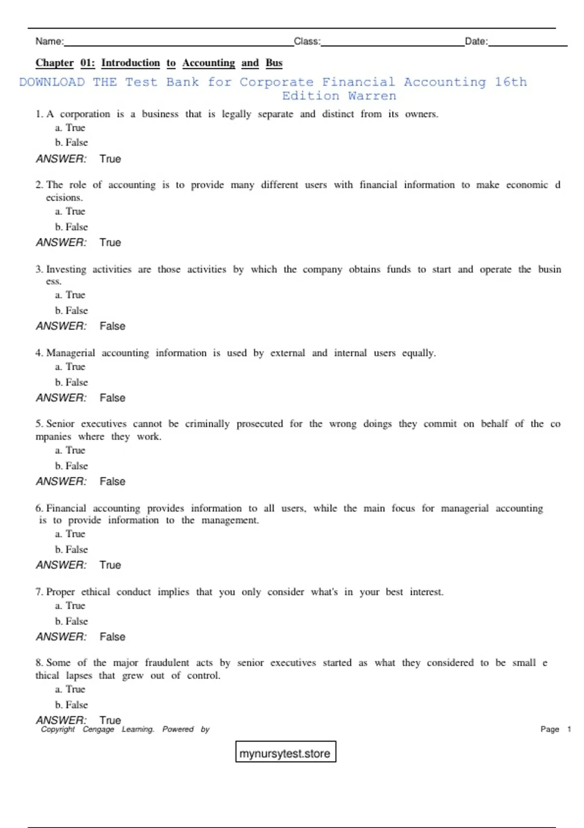DOWNLOAD THE Test Bank for Corporate Financial Accounting 16th