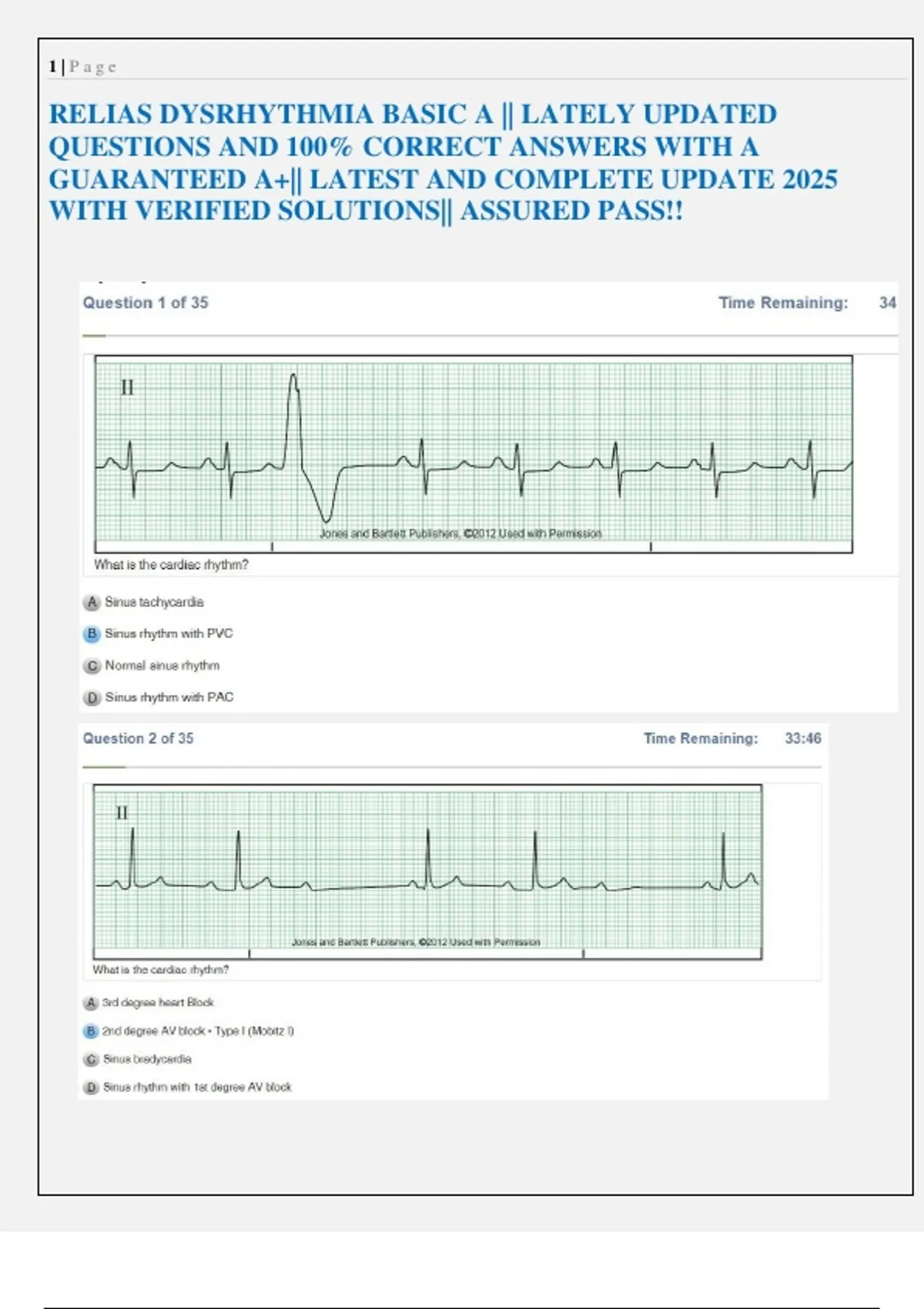 This document contains the complete set of questions and answers for the Relias Dysrhythmia Basic A exam. It provides updated material for 2025, ensuring accurate solutions and guaranteed preparation for passing. The content covers ECG rhythm interpretation and related dysrhythmia practice scenarios, making it a reliable study guide for healthcare professionals preparing for assessments.1 | P a g e QUESTIONS AND 100% CORRECT ANSWERS WITH A GUARANTEED A+|| LATEST AND COMPLETE UPDATE 2025 2 | P a g e 3 | P a g e 4 | P a g e 5 | P a g e 6 | P a g e 7 | P a g e 8 | P a g e 9 | P a g e 10 | P a g e 11 | P a g e 12 | P a g e 13 | P a g e 14 | P a g e 15 | P a g e 16 | P a g e 17 | P a g e 18 | P a g e