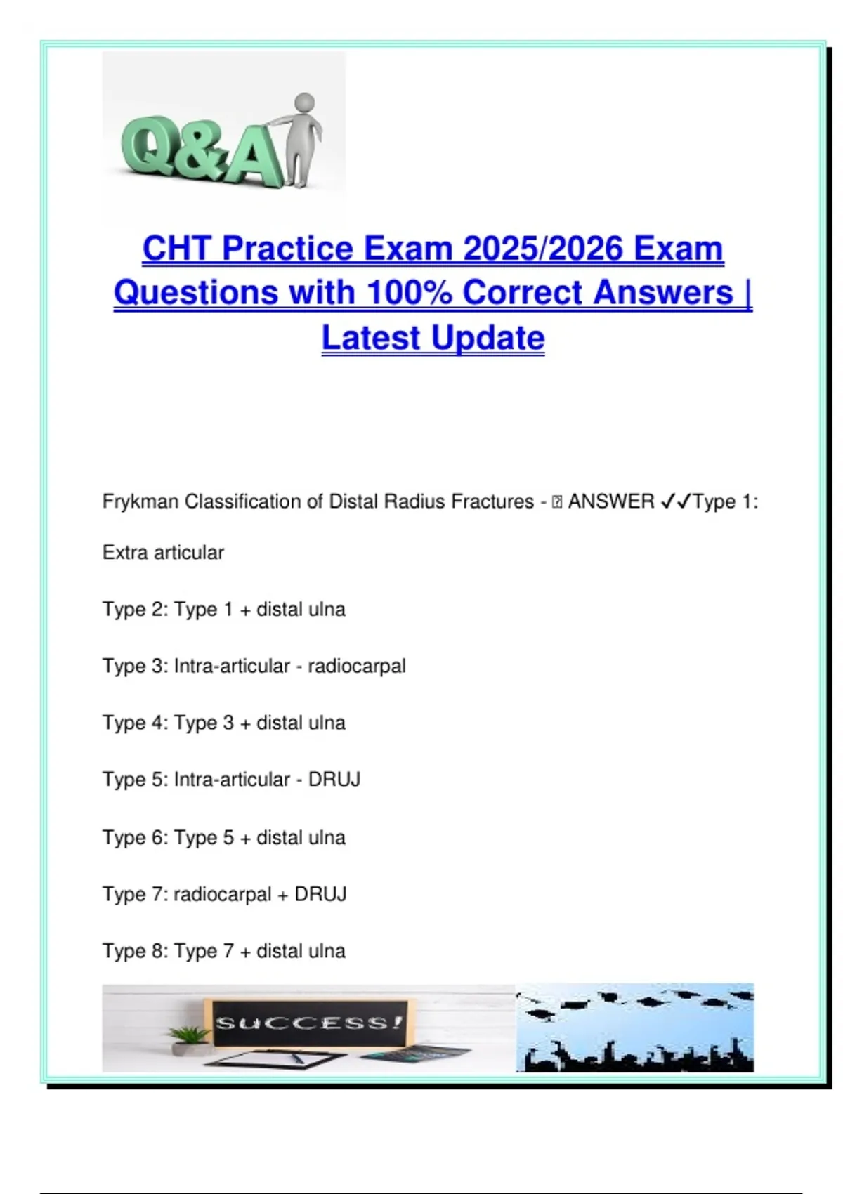 This fully updated 2025/2026 CHT practice exam guide provides 150+ multiple-choice questions with correct answers, carefully curated to simulate real exam conditions for the Certified Hand Therapist (CHT) Exam. The content spans a wide variety of clinically significant topics encountered in hand therapy, surgical rehab, trauma care, and upper extremity pathology, making this a valuable tool for both first-time test-takers and seasoned therapists seeking to maintain certification. Key topics include: Fracture classification systems: Frykman, AO, Gustillo-Anderson (open fractures), and Smith-Hastings Ligament and cartilage pathology: TFCC tear assessment (e.g., trampoline test, wafer procedure) Soft tissue pathology: pyogenic granuloma, scar pressure/tension tools (tonometer, elastometer, oximeter) Neurological signs and syndromes: von Recklinghausen disease, Adson’s, Wright’s, and costoclavicular tests for TOS Peripheral nerve injury and tendon transfer protocols: nerve repair timing, intrinsic transfers, splinting sequences, MP extension management Diagnostic signs: Murphy’s sign, Lhermitte’s sign, Poppen’s ridge test Treatment techniques: stress loading protocols for CRPS (Watson & Carlson), corticosteroid injections for trigger finger, and functional post-op therapy plans Rare conditions and drug-induced deformities: Thalidomide-related phocomelia This exam prep resource is ideal for: Occupational and physical therapy students preparing for the CHT exam Licensed therapists seeking recertification or clinical review Healthcare professionals in orthopedics, hand surgery, and rehabilitation therapy Graduate-level students in biomechanics, kinesiology, and musculoskeletal pathology Clear, clinically relevant, and directly aligned with CHT exam standards, this document supports deep understanding, rapid review, and real-world clinical application. Keywords: CHT practice test, fracture classification systems, TFCC injury, sensory testing tools, provocative tests for TOS, tendon transfer rehab, Murphy sign, Lhermitte sign, pyogenic granuloma, trigger finger injection, stress loading protocol, open fracture grading, Gustillo classification, post-op CHT splints