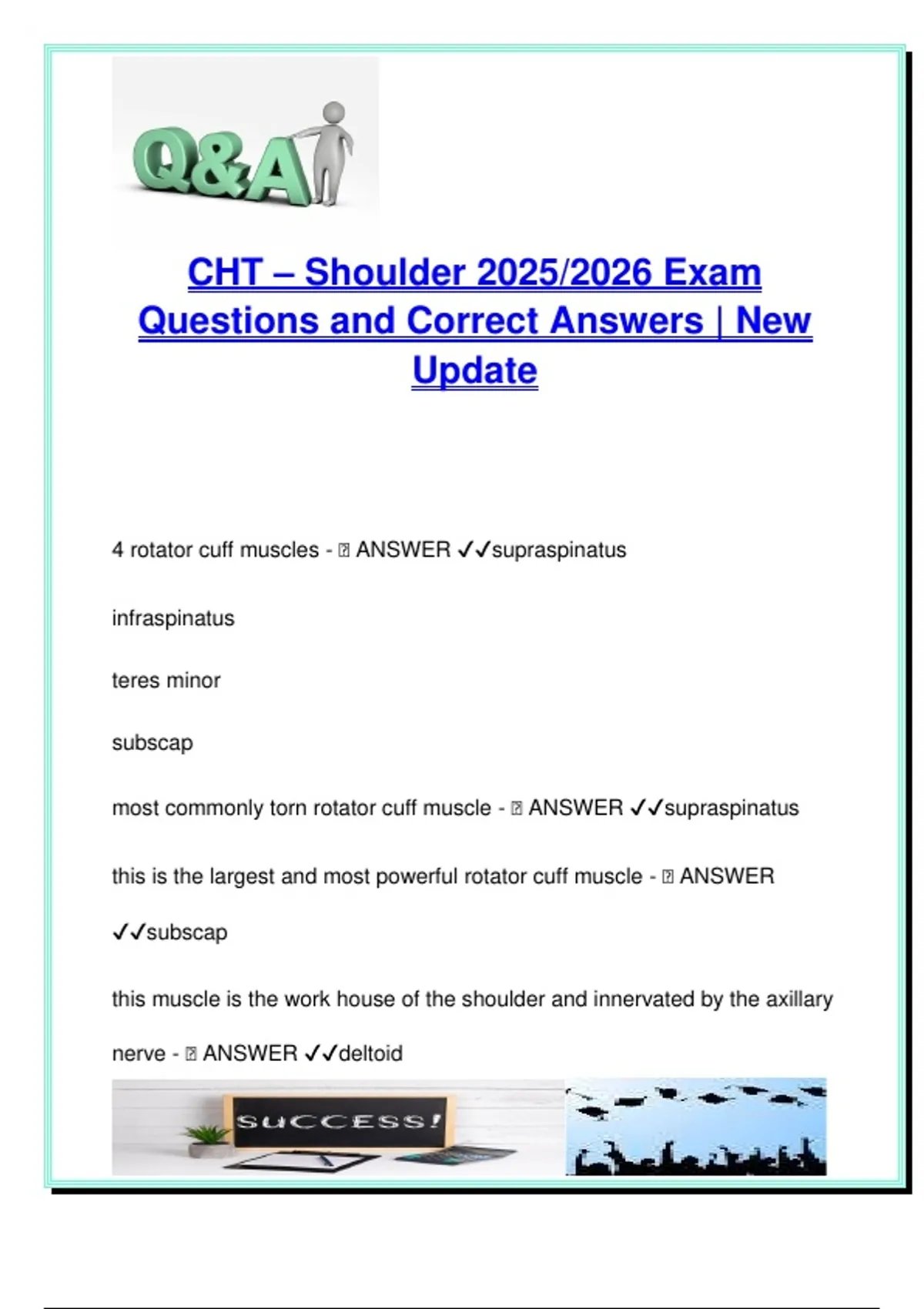 This focused shoulder exam prep guide includes 100+ concise questions and correct answers, ideal for candidates preparing for the Certified Hand Therapist (CHT) Exam 2025/2026 with a targeted emphasis on shoulder anatomy, pathology, biomechanics, and surgical rehab principles. Structured for rapid recall and concept reinforcement, it offers high-yield facts essential for passing the shoulder section of the CHT exam and applying knowledge in clinical orthopedic practice. Key content areas include: Rotator cuff anatomy and function: supraspinatus, infraspinatus, teres minor, subscapularis Common injuries and diagnoses: supraspinatus tear, shoulder impingement, bursitis, adhesive capsulitis Shoulder instability patterns: anterior-inferior instability, Bankart lesions, Hill-Sachs lesions Labral pathology: SLAP lesions, glenoid labrum function and injury mechanics Functional kinematics: painful arc (60–120°), abduction mechanisms, deltoid and supraspinatus roles Open vs arthroscopic repair: surgical differences and implications for rehab GH joint positions: loose-packed vs close-packed positions for treatment and mobilization Biomechanics and stability: humeral head alignment, glenoid congruency, static and dynamic stabilizers Ideal for: Occupational and physical therapy students preparing for the CHT exam Clinicians in orthopedics, upper extremity rehab, or sports therapy Students and professionals reviewing shoulder-specific diagnosis and treatment strategies Educators seeking condensed shoulder-focused material for practical teaching and testing With its bullet-style, fact-rich format and alignment with CHT exam content, this document is perfect for last-minute review or focused practice on high-frequency exam topics. Keywords: CHT shoulder questions, rotator cuff tear, supraspinatus function, shoulder instability, Bankart lesion, Hill-Sachs deformity, glenoid labrum, SLAP tear, adhesive capsulitis, shoulder impingement, arthroscopic vs open repair, GH joint positions, shoulder biomechanics, deltoid abduction
