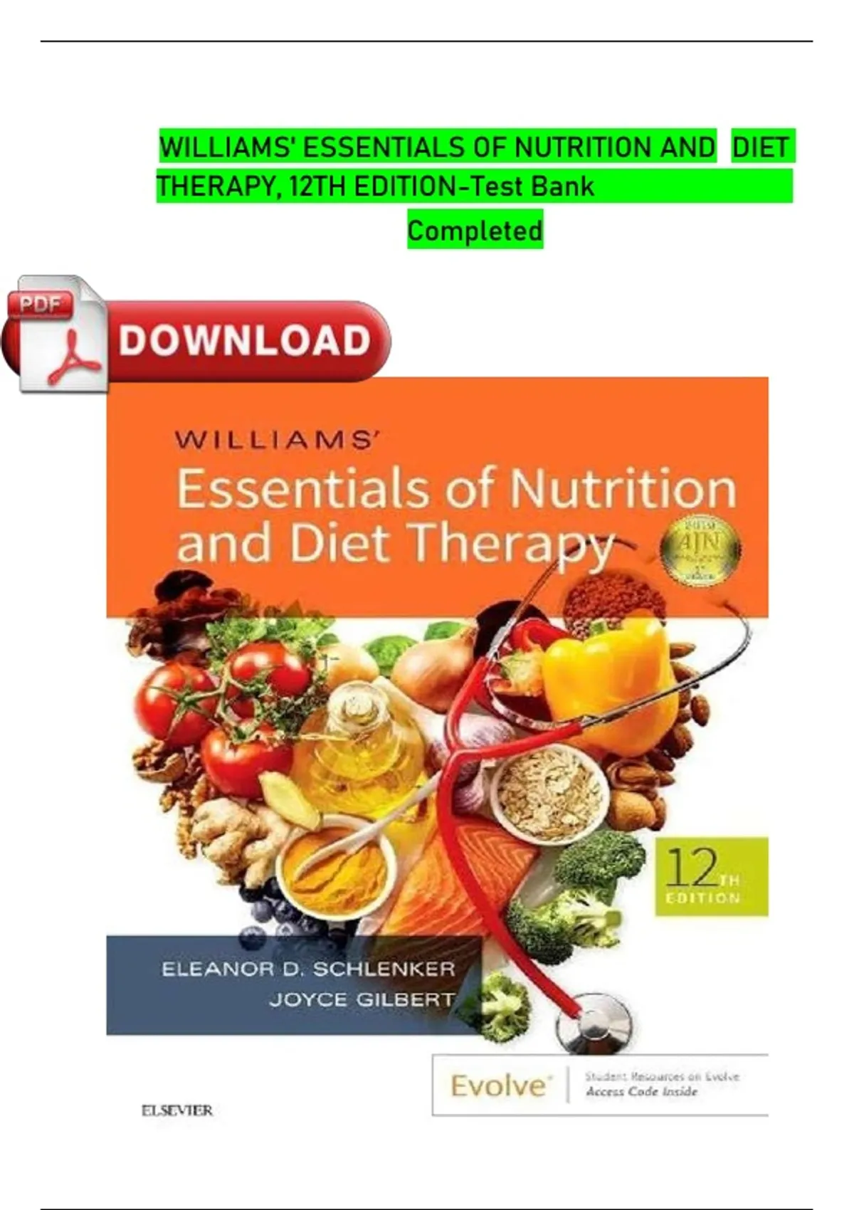 TEST BANK FOR WILLIAMS' ESSENTIALS OF NUTRITION AND DIET THERAPY, 12TH EDITION BY ELEANOR SCHLENKER AND JOYCE ANN GILBERT TABLE OF CONTENT PART 1: INTRODUCTION TO HUMAN NUTRITION 1. Nutrition and Health 2. Digestion, Absorption, and Metabolism 3. Carbohydrates 4. Lipids 5. Proteins 6. Vitamins 7. Minerals and Water 8. Energy Balance PART 2: COMMUNITY NUTRITION AND THE LIFE CYCLE 9. Food Selection and Food Safety 10. Community Nutrition: Promoting Healthy Eating 11. Nutrition During Pregnancy and Lactation 12. Nutrition for Normal Growth and Development 13. Nutrition for Adults: Early, Middle, and Later Years 14. Nutrition and Physical Fitness 15. The Complexity of Obesity: Beyond Energy Balance PART 3: INTRODUCTION TO CLINICAL NUTRITION 16. Nutrition Assessment and Nutrition Therapy in Patient Care 17. Metabolic Stress 18. Drug-Nutrient Interactions 19. Nutrition Support: Enteral and Parenteral Nutrition 20. Gastrointestinal Diseases 21. Diseases of the Heart, Blood Vessels, and Lungs 22. Diabetes Mellitus 23. Renal Disease 24. Acquired Immunodeficiency Syndrome (AIDS) 25. Cancer