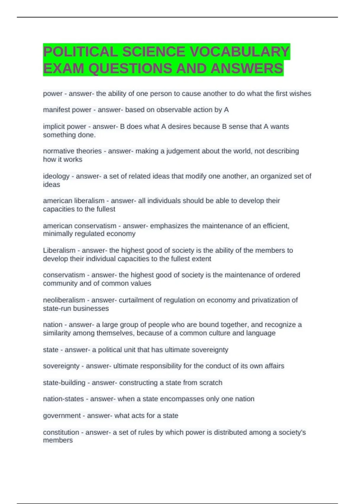 POLITICAL SCIENCE VOCABULARY EXAM QUESTIONS AND ANSWERS power - answer- the ability of one person to cause another to do what the first wishes manifest power - answer- based on observable action by A implicit power - answer- B does what A desires because B sense that A wants something done. normative theories - answer- making a judgement about the world, not describing how it works ideology - answer- a set of related ideas that modify one another, an organized set of ideas american liberalism - answer- all individuals should be able to develop their capacities to the fullest american conservatism - answer- emphasizes the maintenance of an efficient, minimally regulated economy Liberalism - answer- the highest good of society is the ability of the members to develop their individual capacities to the fullest extent conservatism - answer- the highest good of society is the maintenance of ordered community and of common values neoliberalism - answer- curtailment of regulation on economy and privatization of state-run businesses nation - answer- a large group of people who are bound together, and recognize a similarity among themselves, because of a common culture and language state - answer- a political unit that has ultimate sovereignty sovereignty - answer- ultimate responsibility for the conduct of its own affairs state-building - answer- constructing a state from scratch nation-states - answer- when a state encompasses only one nation
