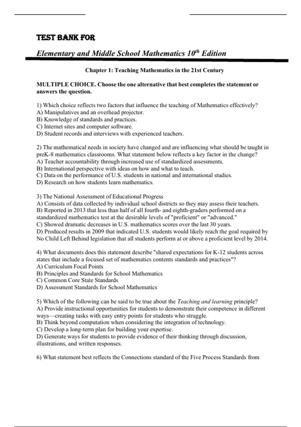 Test Bank for Elementary and Middle School Mathematics, 10th Edition (Walle, 2020), Chapter 1-22 |All Chapters