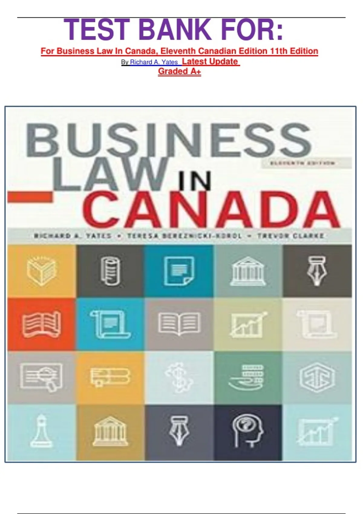TEST BANK FOR: For Business Law In Canada, Eleventh Canadian Edition 11th Edition By Richard A. Yates Latest Update Graded A+