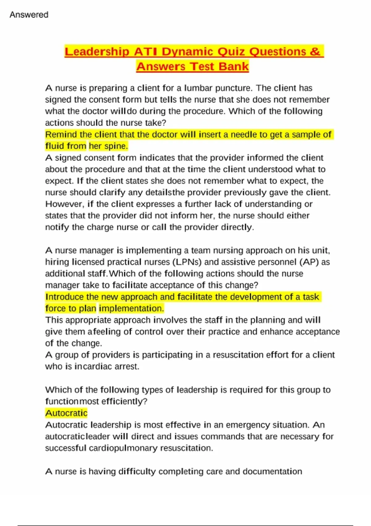 Test bank For Leadership ATI Dynamic Quiz Questions and Answers