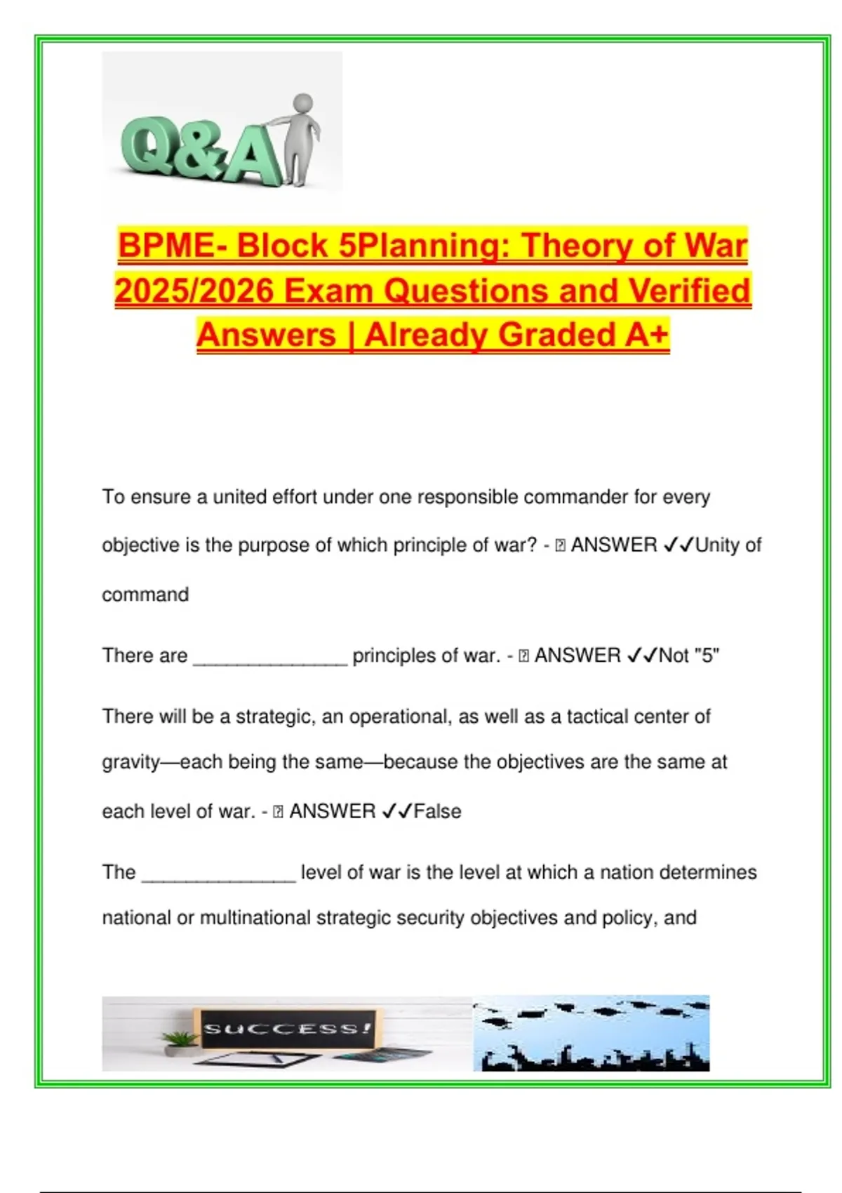 This A+ graded, expert-verified study document contains the complete set of exam questions and correct answers for Block 5 – Planning: Theory of War, part of the Basic Professional Military Education (BPME) Enlisted Curriculum for the 2025/2026 academic year. It serves as a highly targeted review for understanding how military operations are conceptualized, planned, and executed across multiple levels of war. Key learning areas include: The three levels of war: Strategic, Operational, and Tactical — including how national objectives translate into battlefield outcomes Principles of war such as unity of command, security, mass, and maneuver, with clear explanations of their purpose and application The concept of centers of gravity (COG) at each level of warfare and why they differ depending on scope and objectives Strategic decision-making at the national and multinational level and its link to resource allocation and policy formulation Clarity on commonly misunderstood terms such as “global” (not a formal level of war), and the distinction between engagements, battles, and campaigns This document is highly beneficial for: Enlisted Navy personnel preparing for BPME advancement exams NROTC and OCS candidates studying military theory and strategy Military science students, joint operations planners, and warfare strategy professionals Anyone seeking mastery of operational doctrine within the U.S. military context Every question is paired with the correct answer for efficient, high-impact studying. The material is perfectly suited for promotion boards, PME modules, and exam prep. Keywords: BPME Block 5, theory of war, levels of war, unity of command, strategic planning, tactical execution, operational warfare, center of gravity, principles of war, military strategy, security in warfare, joint operations, military education, PME prep