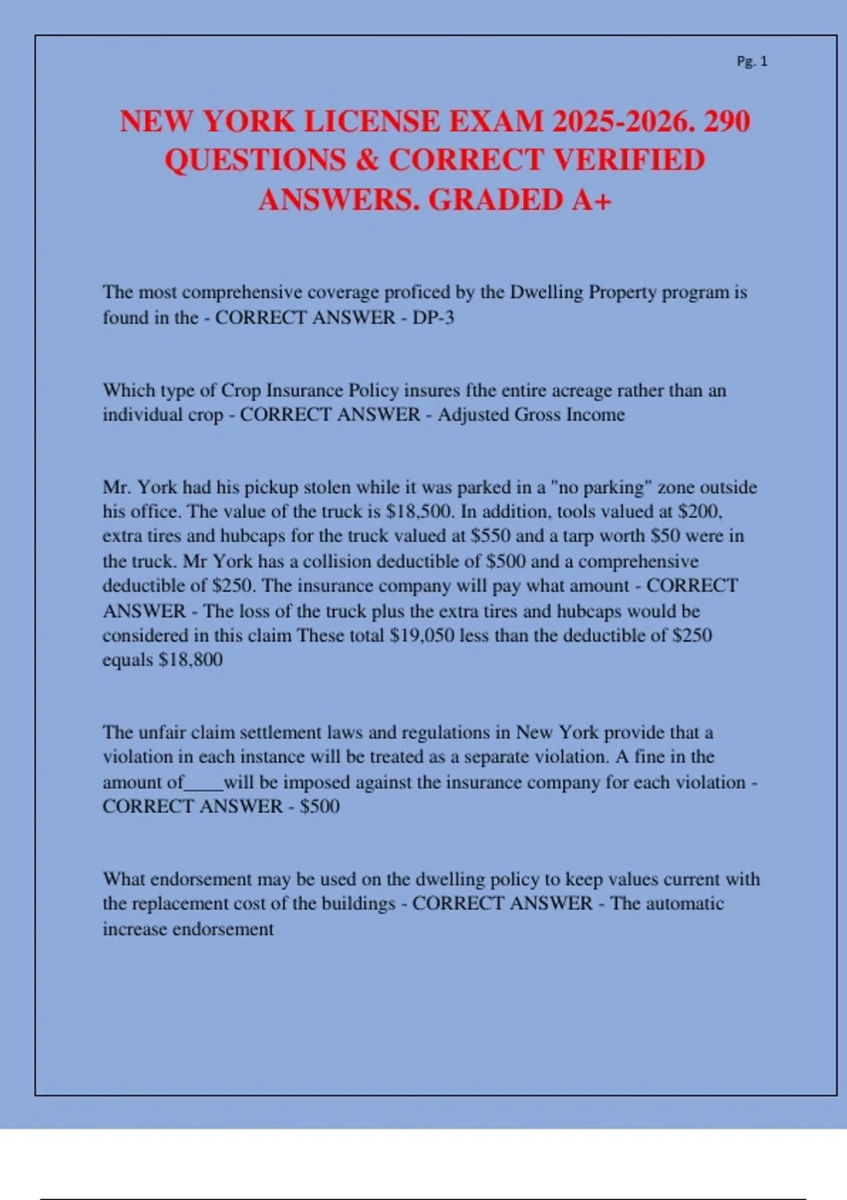 This document provides 290 verified and correct exam questions and answers for the 2025–2026 New York Insurance License Exam. It covers key topics including dwelling property programs (DP-1, DP-2, DP-3), homeowner and farm policies, flood and marine coverage, businessowner’s policies (BOP), crop insurance, terrorism risk coverage, claim settlement laws, and adjuster responsibilities. The material also reviews endorsements, exclusions, deductibles, loss settlements, and state-specific insurance regulations, making it a reliable A+ resource for exam preparation.