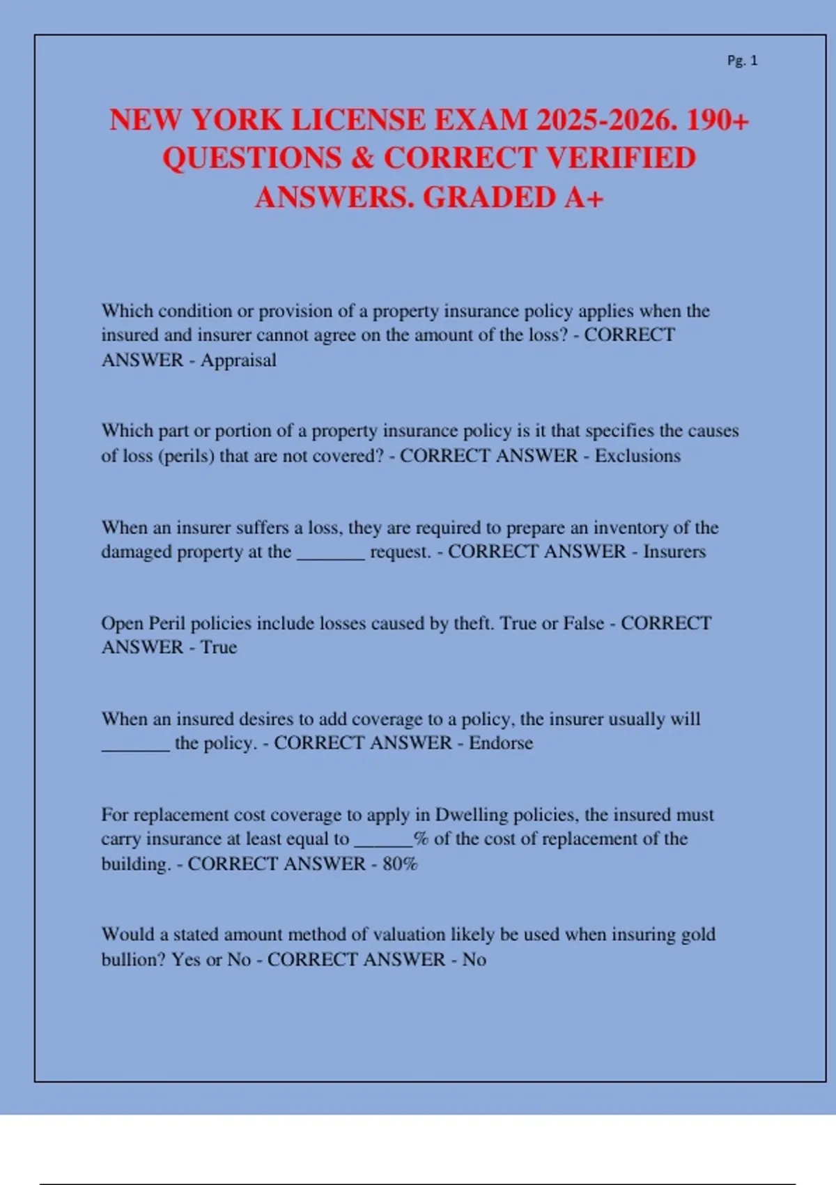 This exam study guide contains over 190 verified questions and correct answers for the 2025–2026 New York Insurance License Exam. It covers core insurance concepts including property and casualty policy provisions, homeowners and dwelling forms (DP-1, DP-2, DP-3, HO-2, HO-3, HO-4, HO-6, HO-8), businessowners policies (BOP), farm and crop insurance, flood and marine coverage, equipment breakdown, liability exposures, negligence, and legal doctrines. The material emphasizes policy conditions, endorsements, exclusions, valuation methods, and state-specific insurance laws, making it a complete A+ preparation resource.