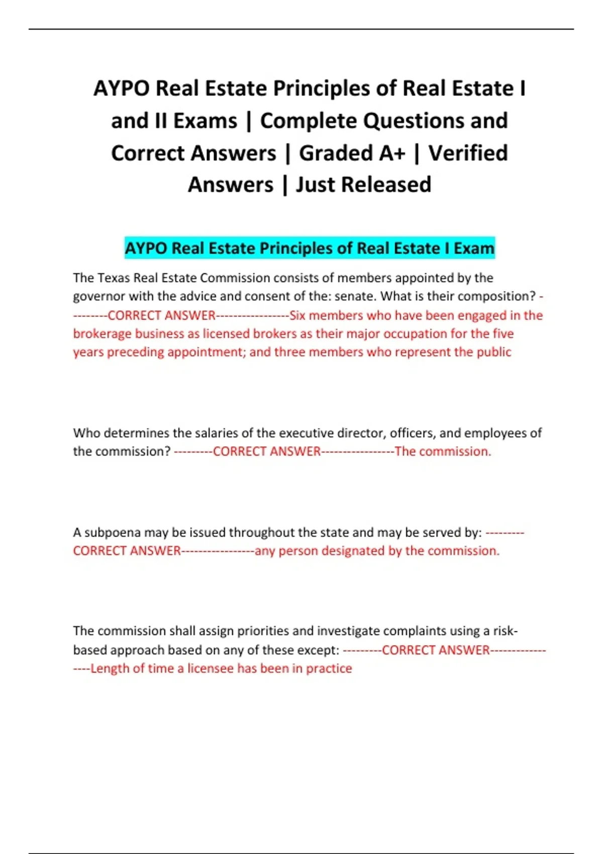 AYPO Real Estate Principles of Real Estate I Exam