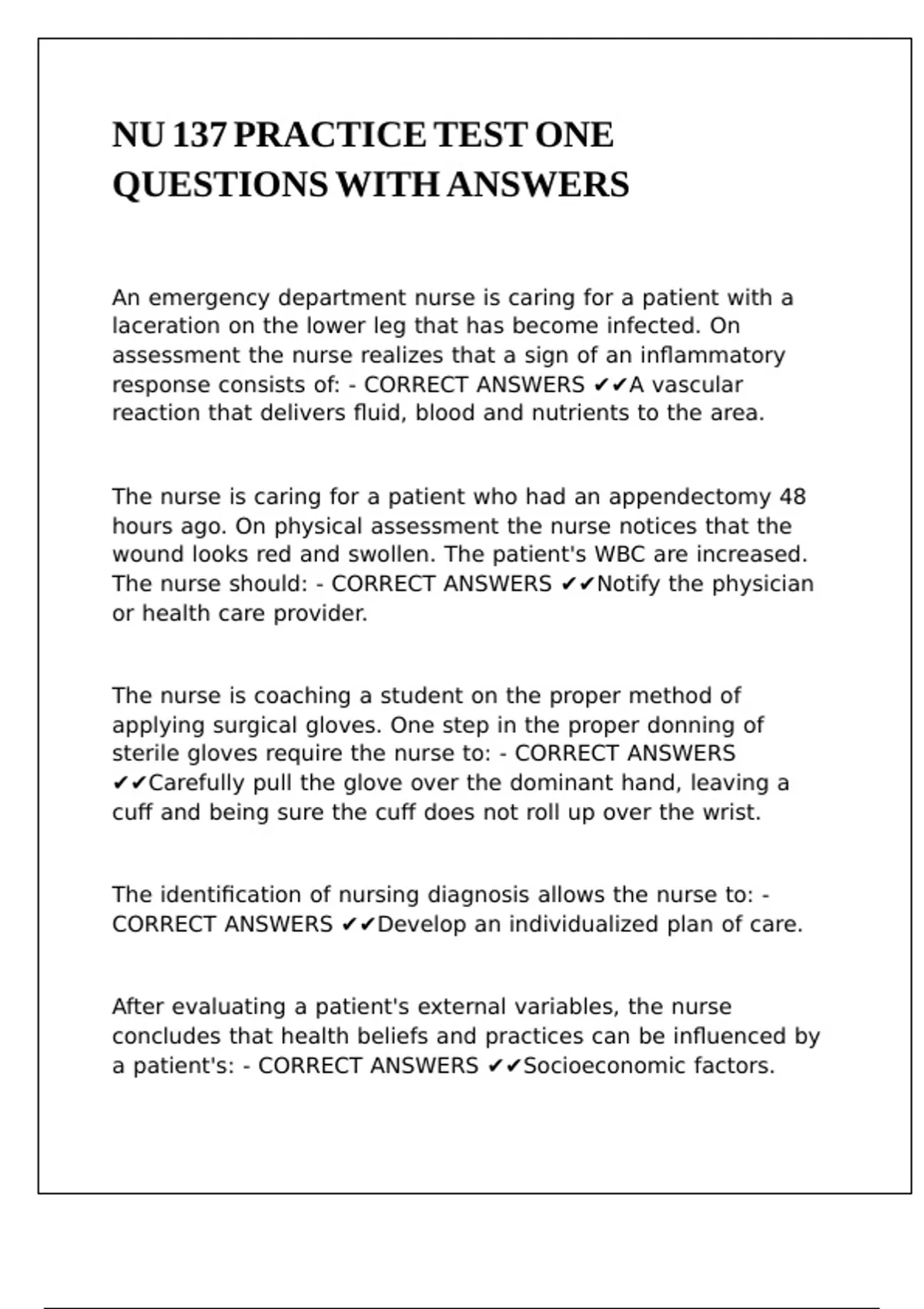 NU 137 PRACTICE TEST ONE QUESTIONS WITH ANSWERS,