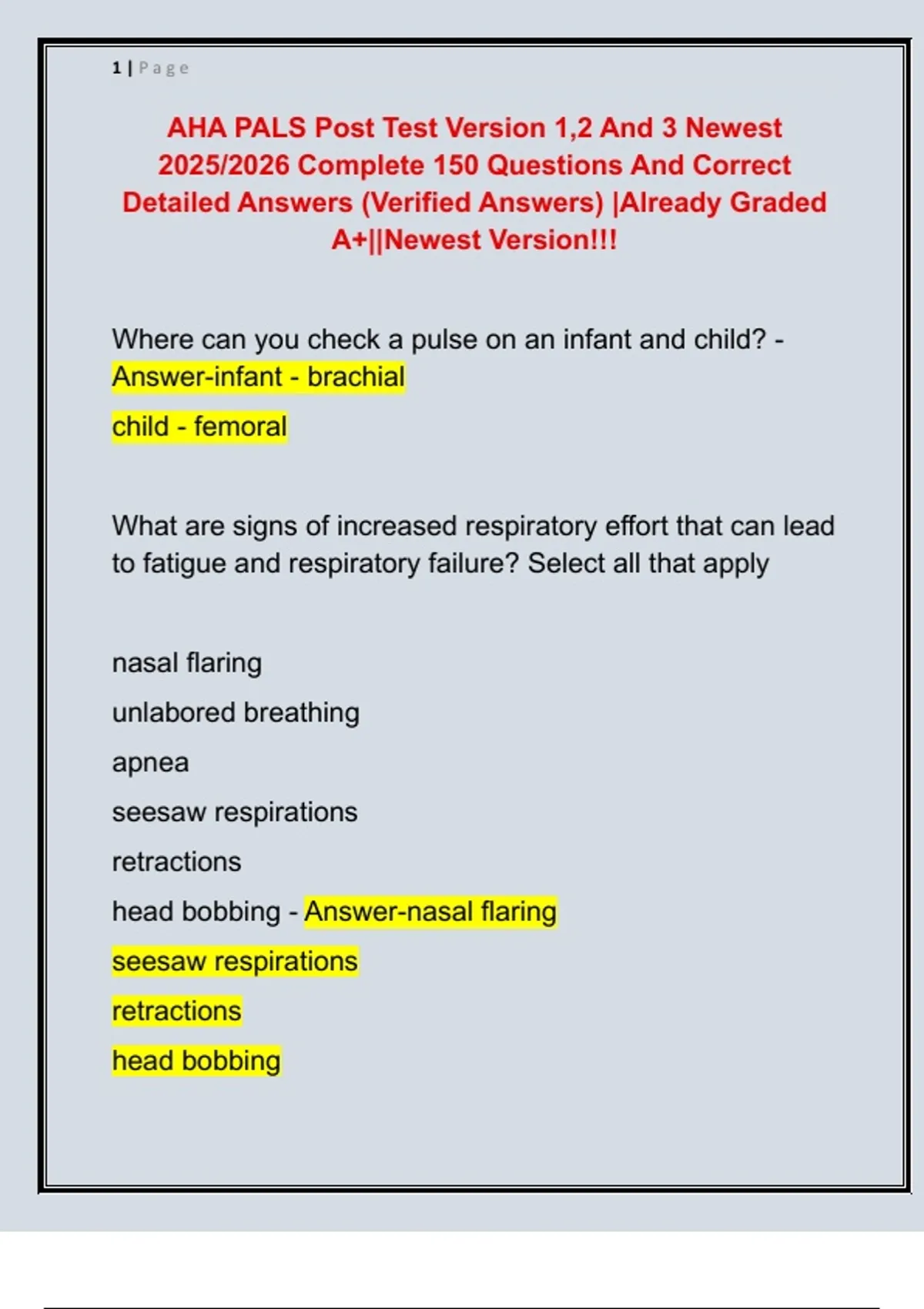 AHA PALS Post Test Version 1,2 And 3 Newest