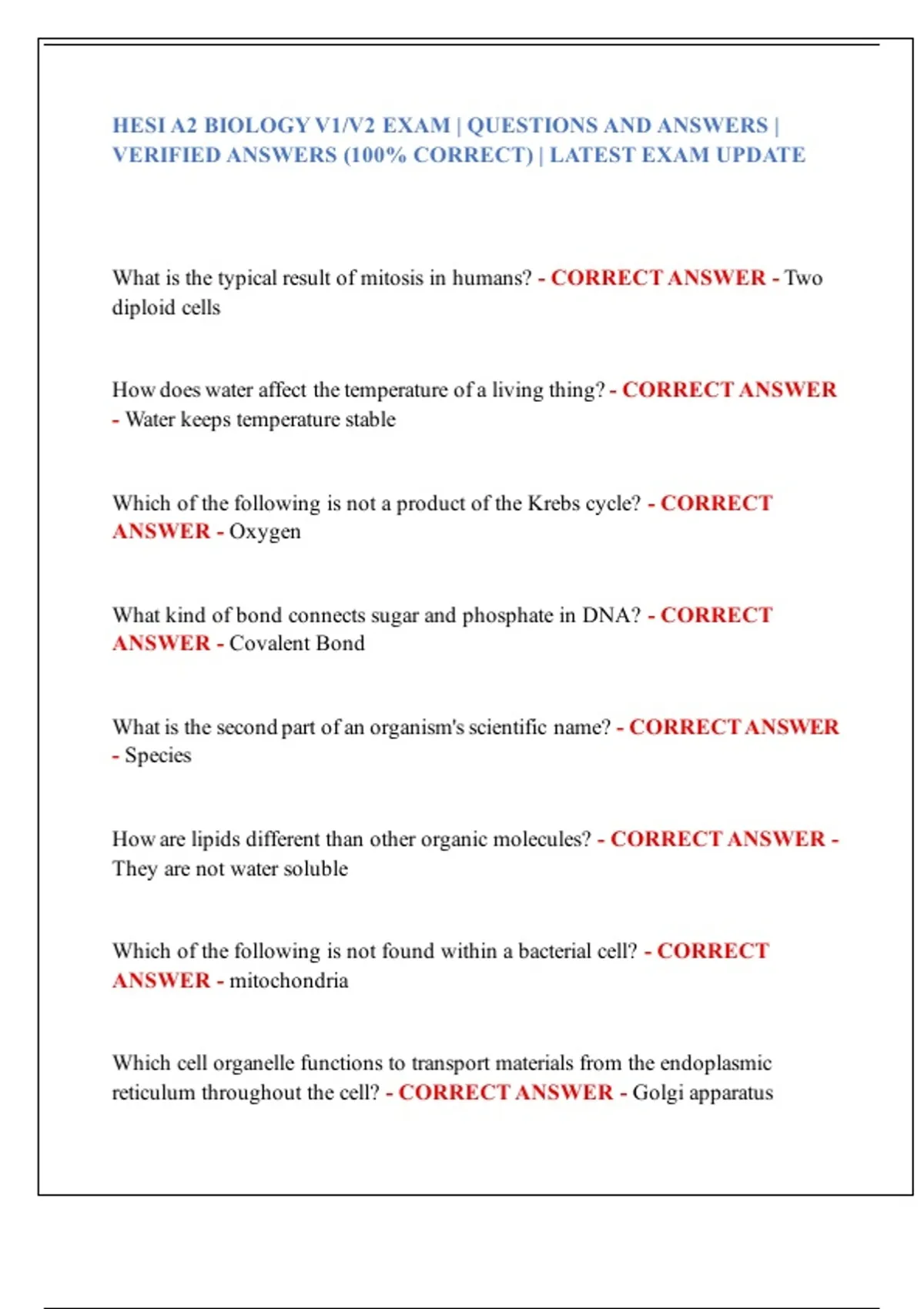 HESI A2 BIOLOGY V1/V2 EXAM | QUESTIONS AND ANSWERS |