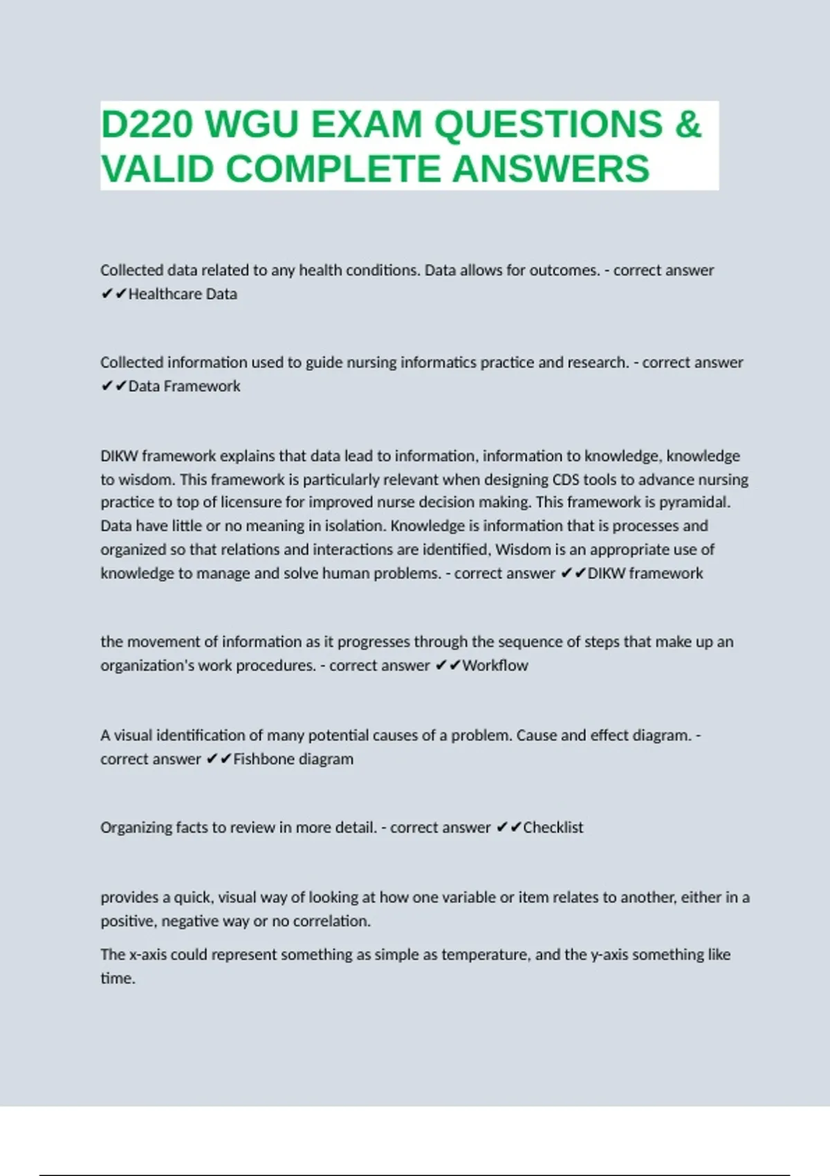 D220 WGU EXAM QUESTIONS & VALID COMPLETE ANSWERS Collected data related to any health conditions. Data allows for outcomes. - correct answer Healthcare Data Collected information used to guide nursing informatics practice and research. - correct answer Data Framework DIKW framework explains that data lead to information, information to knowledge, knowledge to wisdom. This framework is particularly relevant when designing CDS tools to advance nursing practice to top of licensure for improved nurse decision making. This framework is pyramidal. Data have little or no meaning in isolation. Knowledge is information that is processes and organized so that relations and interactions are identified, Wisdom is an appropriate use of knowledge to manage and solve human problems. - correct answer DIKW framework the movement of information as it progresses through the sequence of steps that make up an organization's work procedures. - correct answer Workflow A visual identification of many potential causes of a problem. Cause and effect diagram. - correct answer Fishbone diagram Organizing facts to review in more detail. - correct answer Checklist provides a quick, visual way of looking at how one variable or item relates to another, either in a positive, negative way or no correlation.