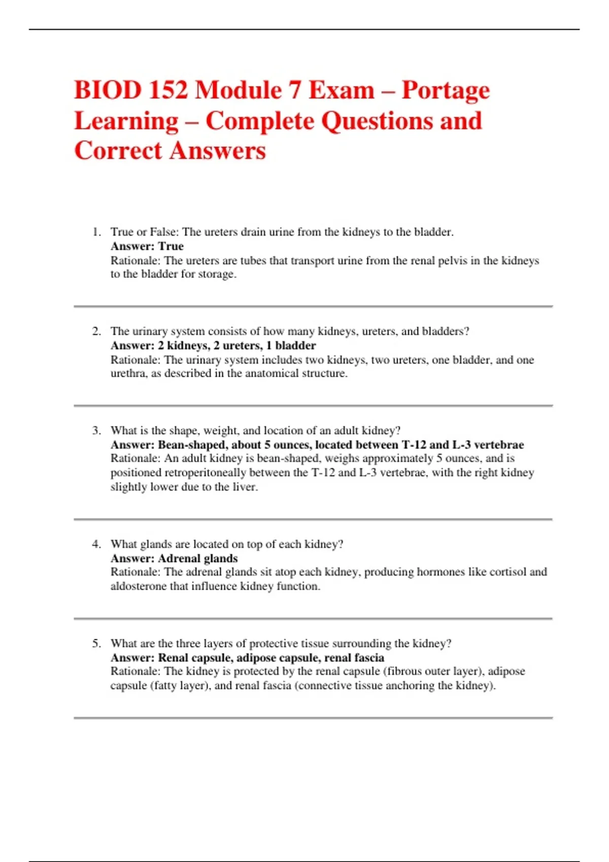 Rationale: An adult kidney is bean-shaped, weighs approximately 5 ounces, and is