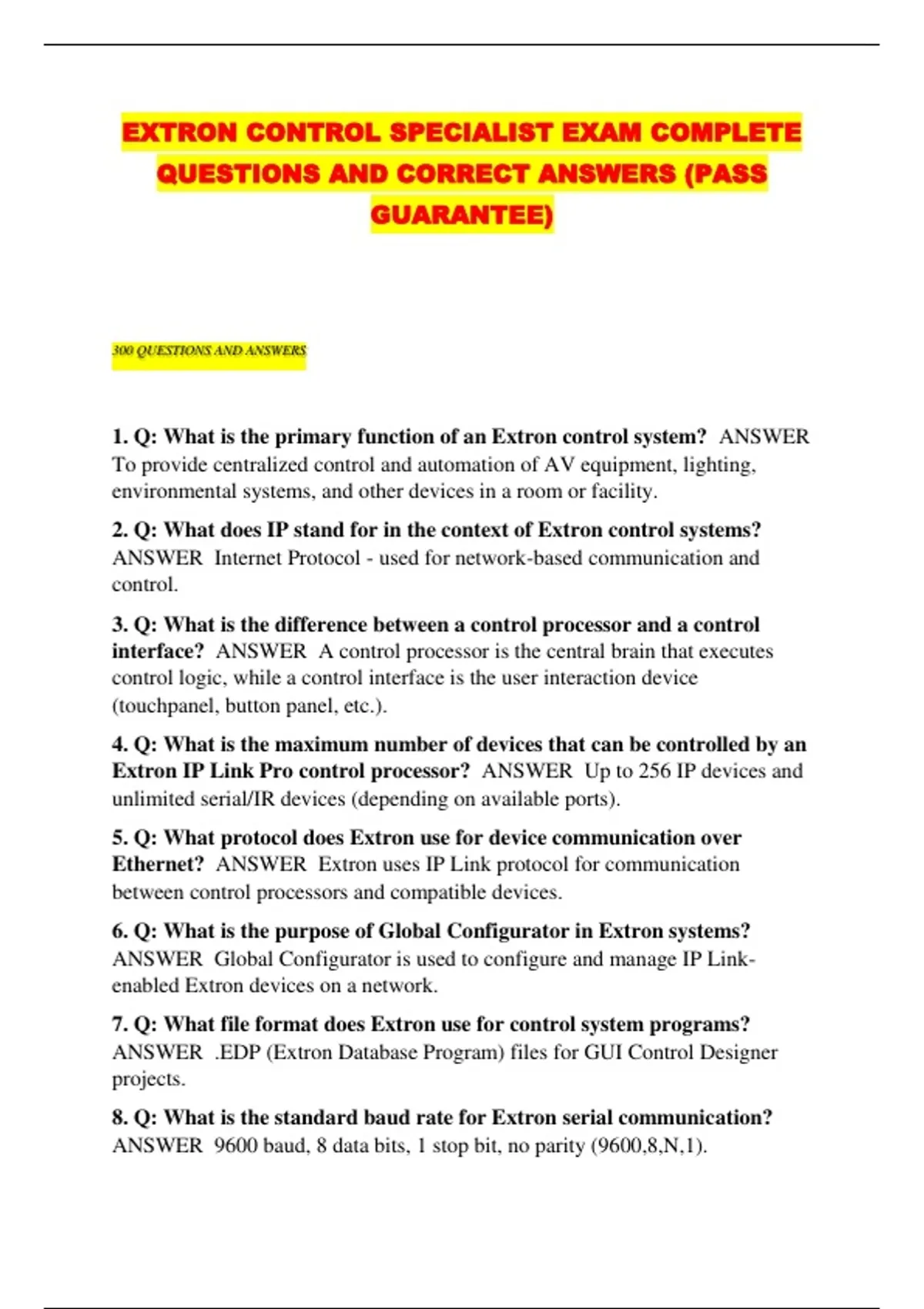 EXTRON CONTROL SPECIALIST EXAM COMPLETE QUESTIONS AND CORRECT ANSWERS (PASS GUARANTEE...