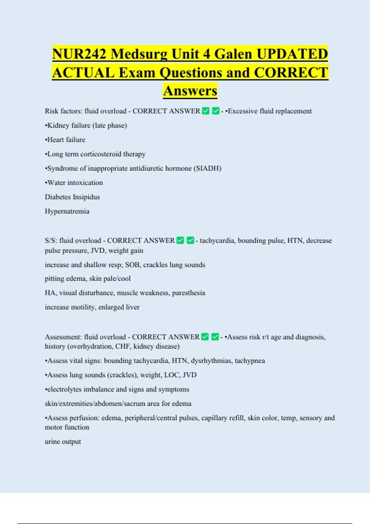 Assessment: fluid overload - CORRECT ANSWER - •Assess risk r/t age and diagnosis,