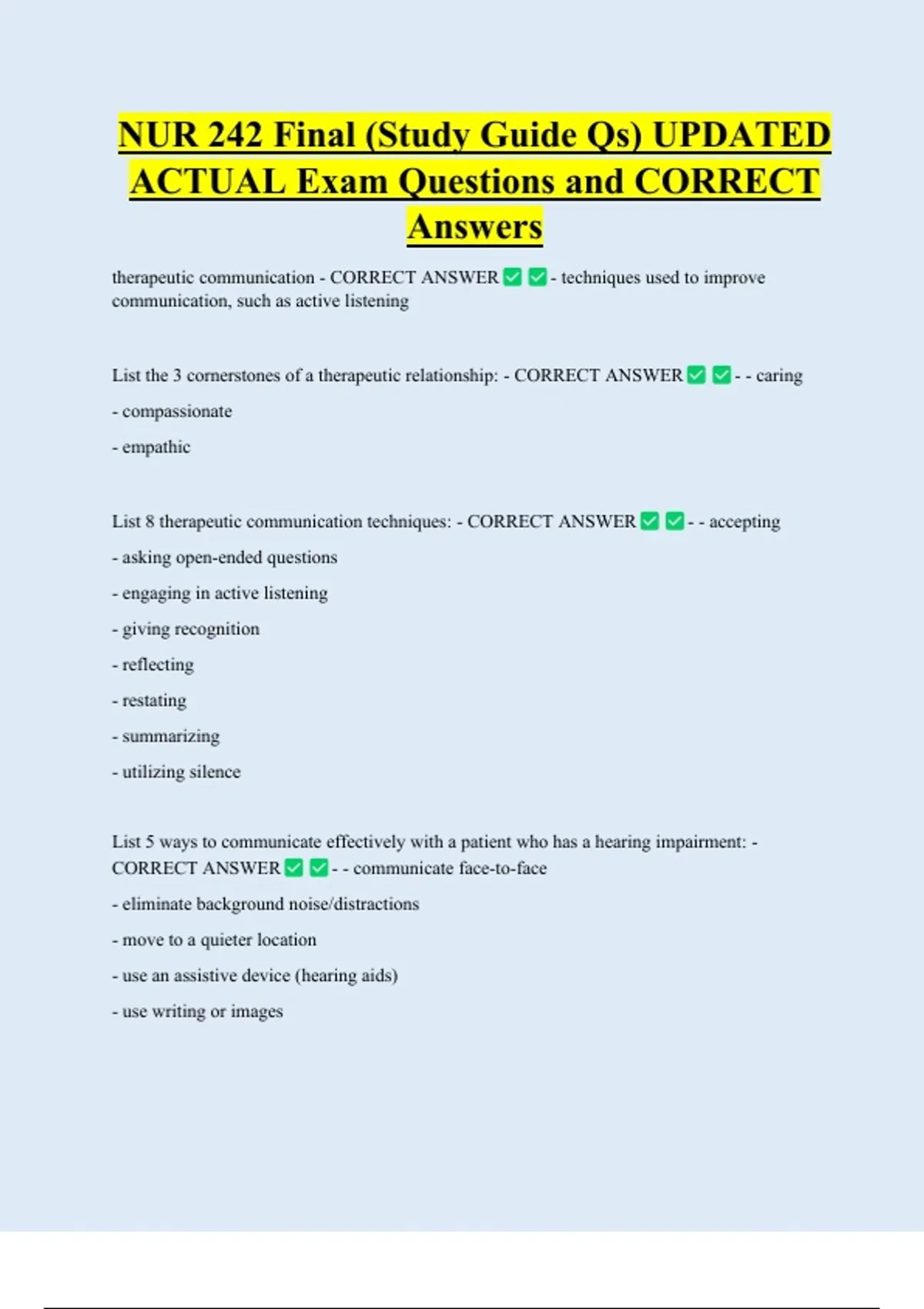 NUR 242 Final (Study Guide Qs) UPDATED ACTUAL Exam Questions and CORRECT Answers therapeutic communication - CORRECT ANSWER communication, such as active listening - techniques used to improve List the 3 cornerstones of a therapeutic relationship: - CORRECT ANSWER - compassionate - empathic List 8 therapeutic communication techniques: - CORRECT ANSWER - asking open-ended questions - engaging in active listening - giving recognition - reflecting - restating - summarizing - utilizing silence - - caring - - accepting