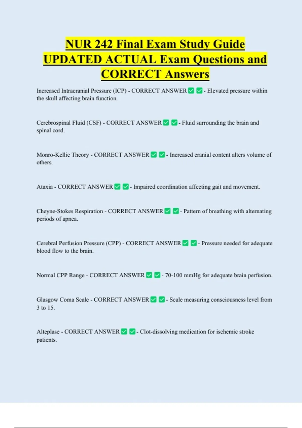 NUR 242 Final Exam Study Guide UPDATED ACTUAL Exam Questions and CORRECT Answers Increased Intracranial Pressure (ICP) - CORRECT ANSWER the skull affecting brain function. Cerebrospinal Fluid (CSF) - CORRECT ANSWER - Elevated pressure within - Fluid surrounding the brain and spinal cord. Monro-Kellie Theory - CORRECT ANSWER others. Ataxia - CORRECT ANSWER - Increased cranial content alters volume of